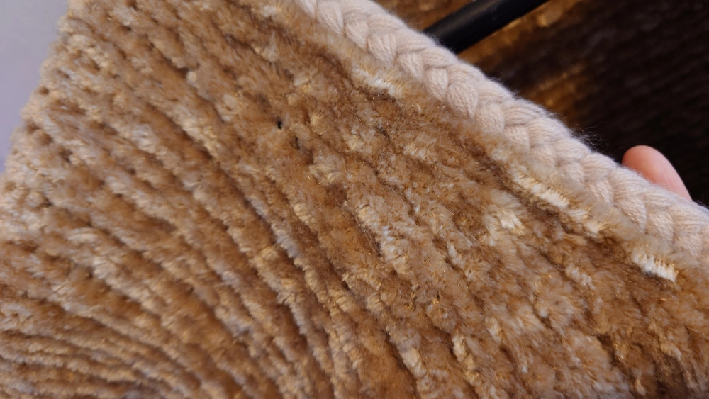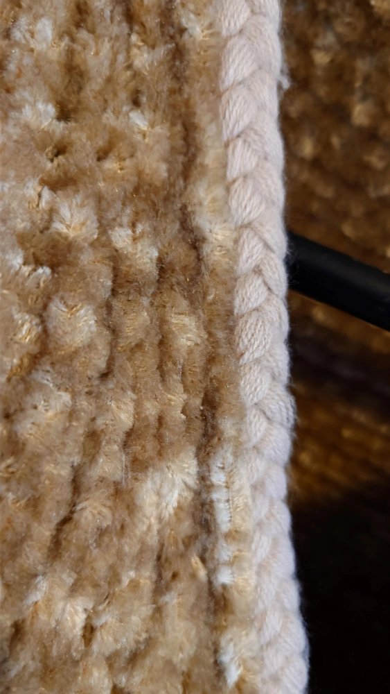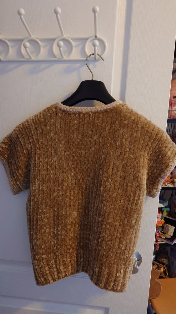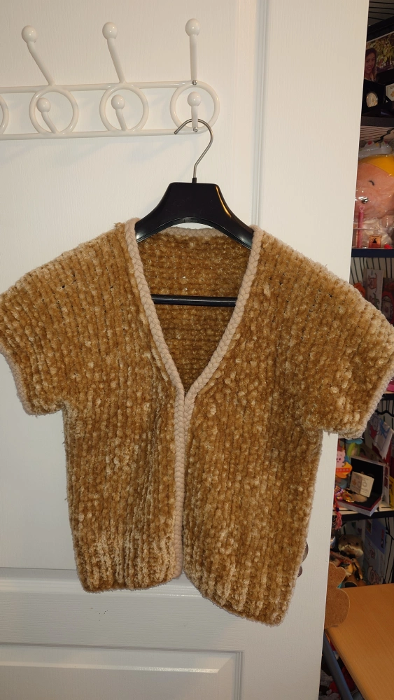 Unique camel hand-knitted cardigan with short sleeves, a V-neck, and a braided trim.