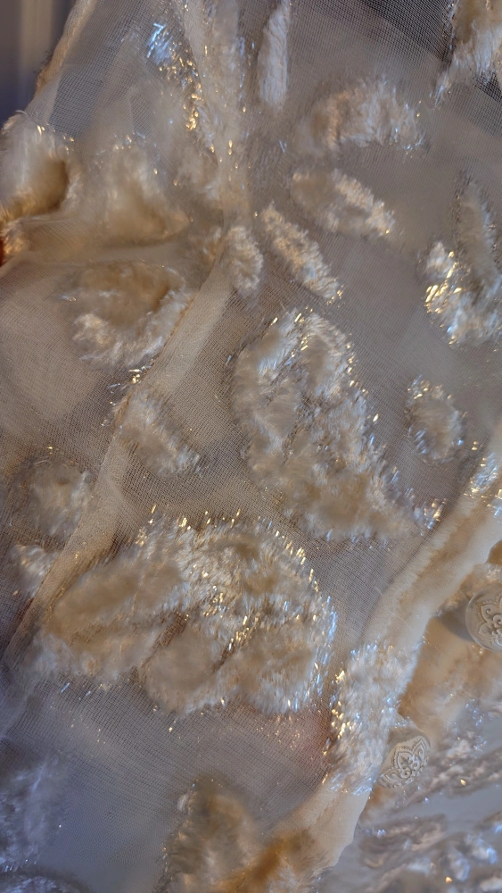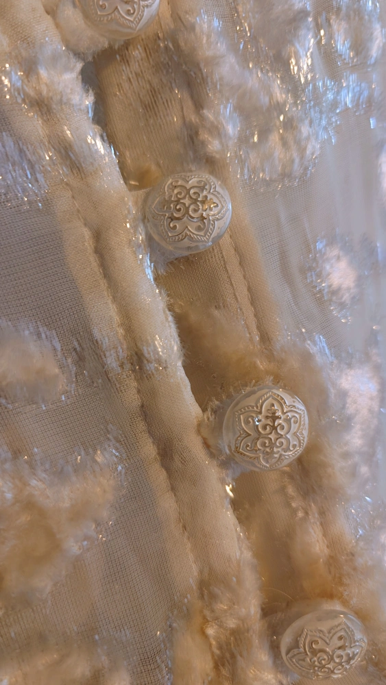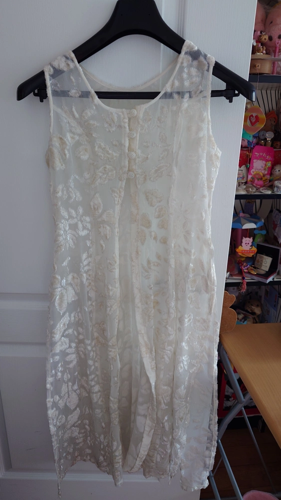 Sleeveless white dress with button closure. Slightly sheer material and shimmering pattern.