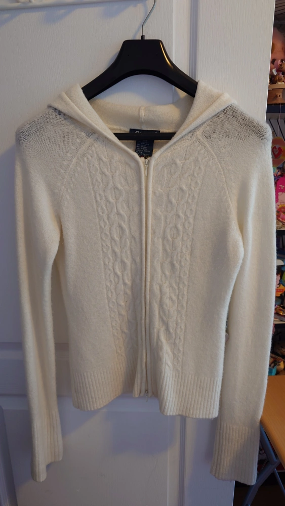 White cable knit hooded sweater with a zipper closure. Long sleeves and ribbed cuffs.