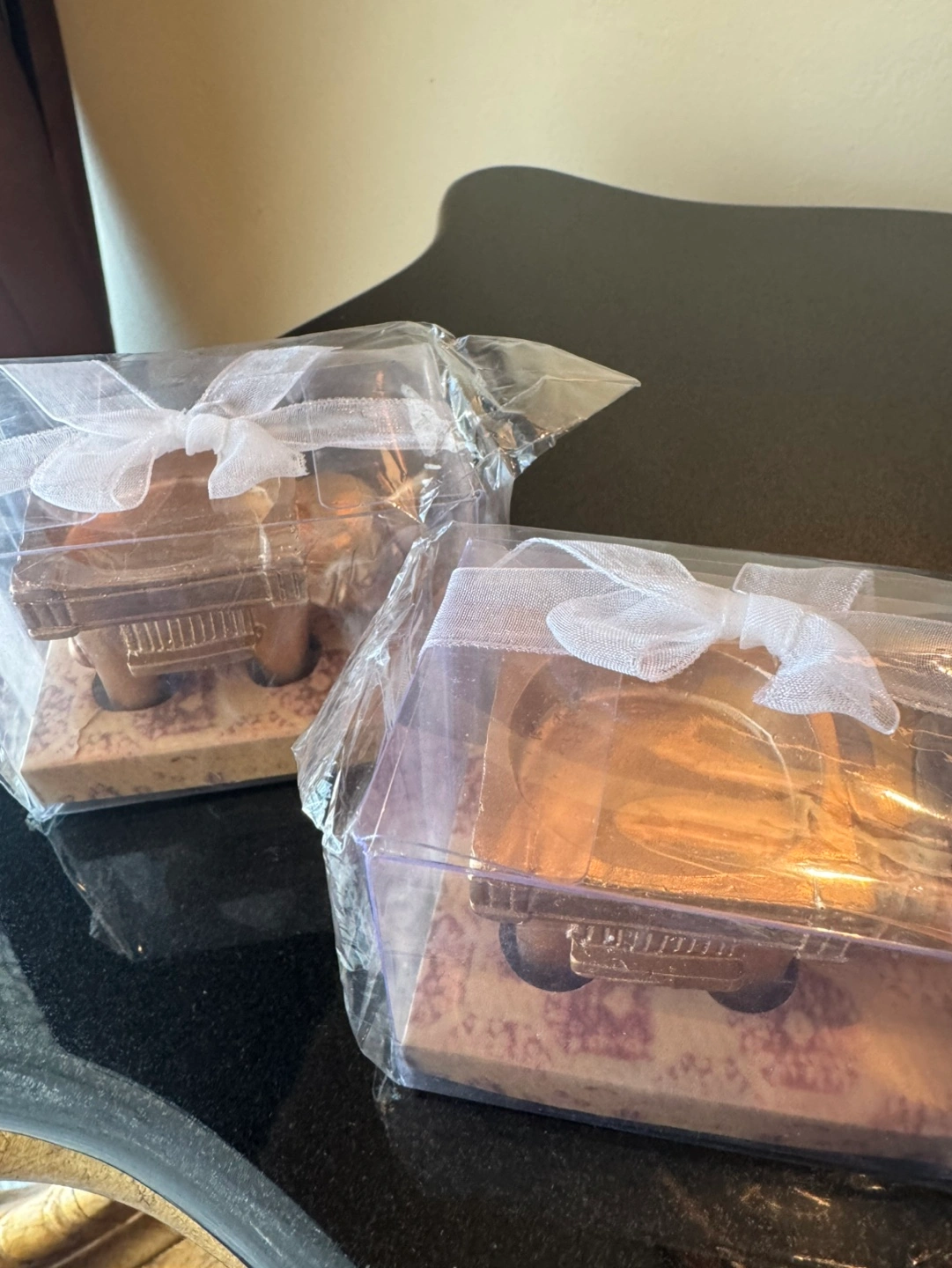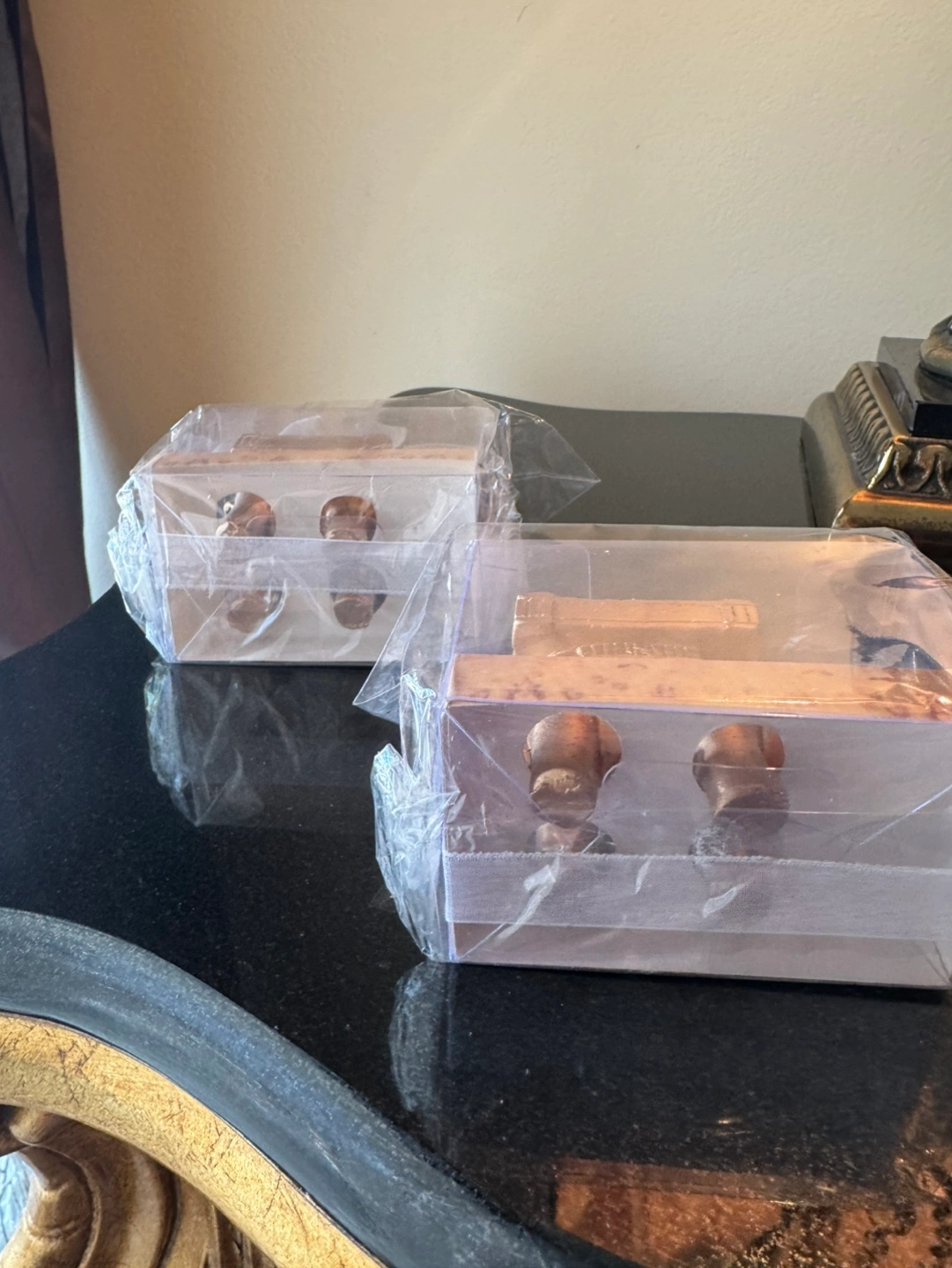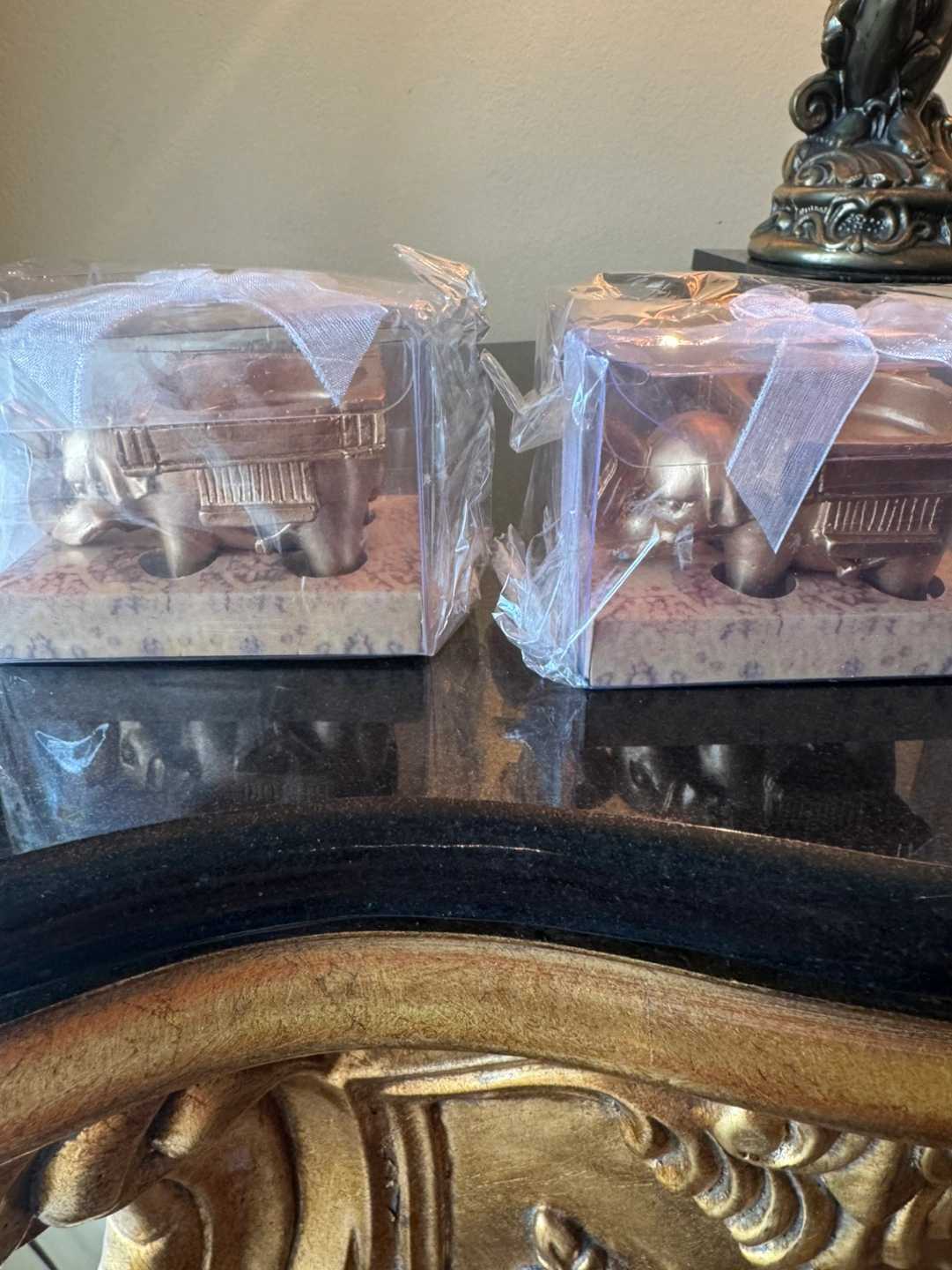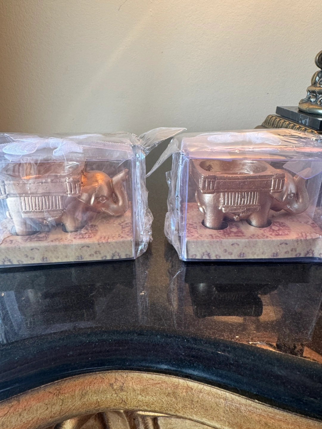 60Set of two gold elephant candle holders. Comes in a clear plastic box with a white ribbon.