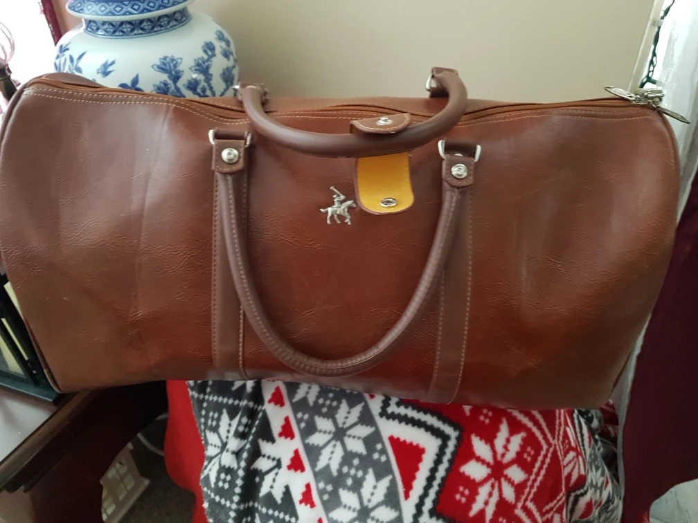 Brown leather travel bag with a silver horse and rider logo. Has two top handles, a zippered top closure. Vegan Leather.