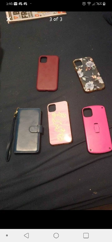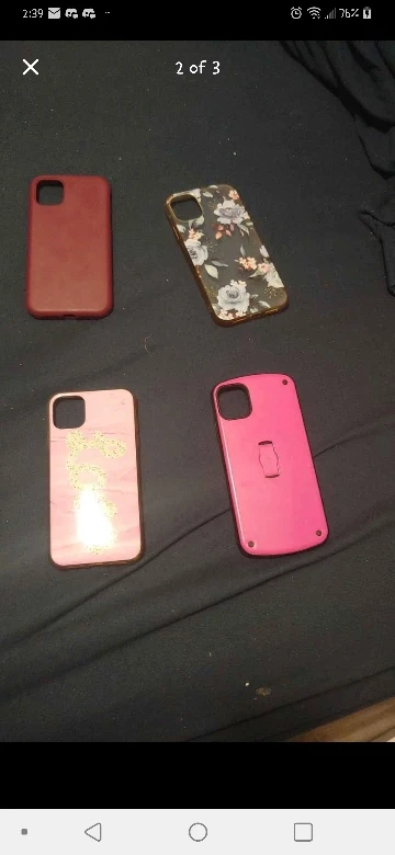 Five phone cases. Two are solid colours, one has a floral pattern, one has a marble pattern with glitter, and one is pink with a ring holder. All are in good condition.