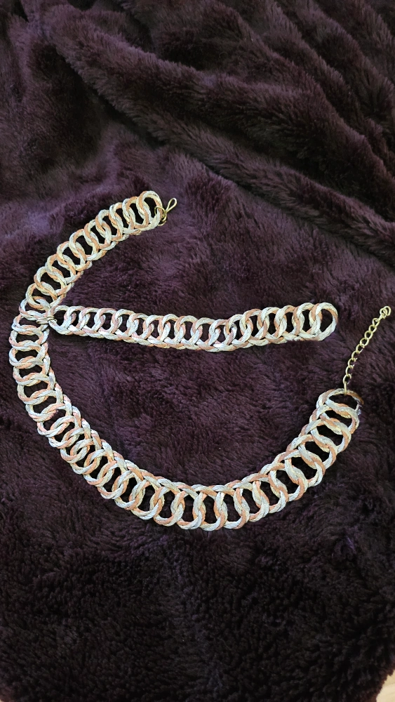 Silver, copper and gold tone chain necklace and bracelet set. The necklace is approximately 17 inches long and the bracelet is approximately 7.5 inches. Both pieces are in pristine condition and would make a great addition to your jewelry collection. Twisted metals lie flat on neck, chest and wrist.
