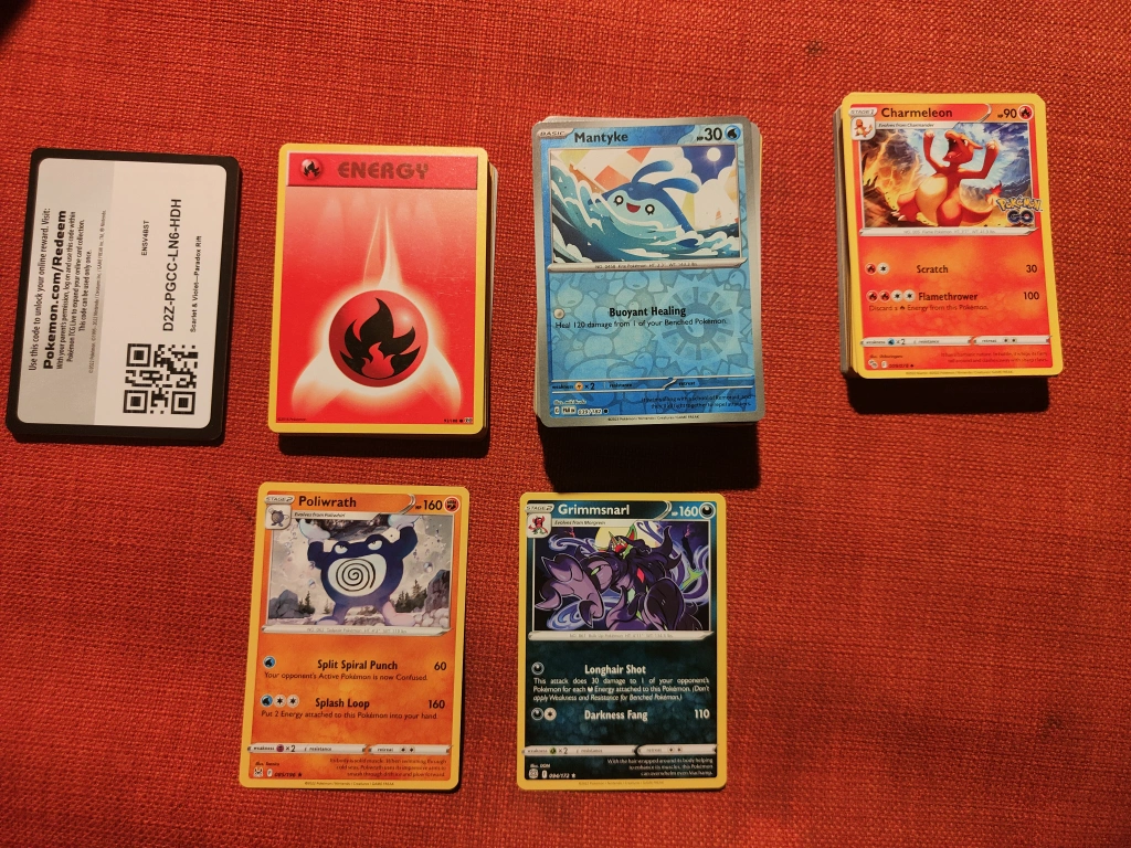 Lot of Pokemon cards, including 27 energy cards, 80 common with some holos, 38 uncommon with some holos, Poliwrath rare, Grimmsnarl rare plus 7 codes to play the tgc game online from trick & trade, paradox rift, obsidian flames, brilliant stars, lost origin, silver tempest and other old expansions Sold in block, not separated, all in mint condition