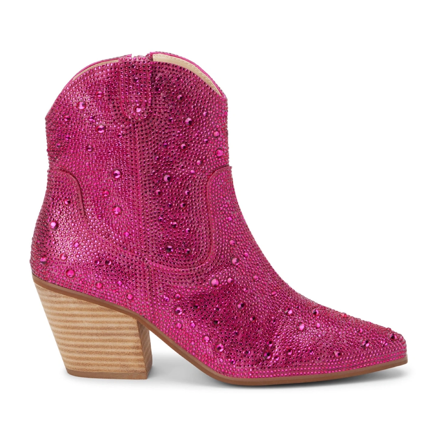 Pink cowboy boots covered in rhinestones. Block heel. Zipper on the side.