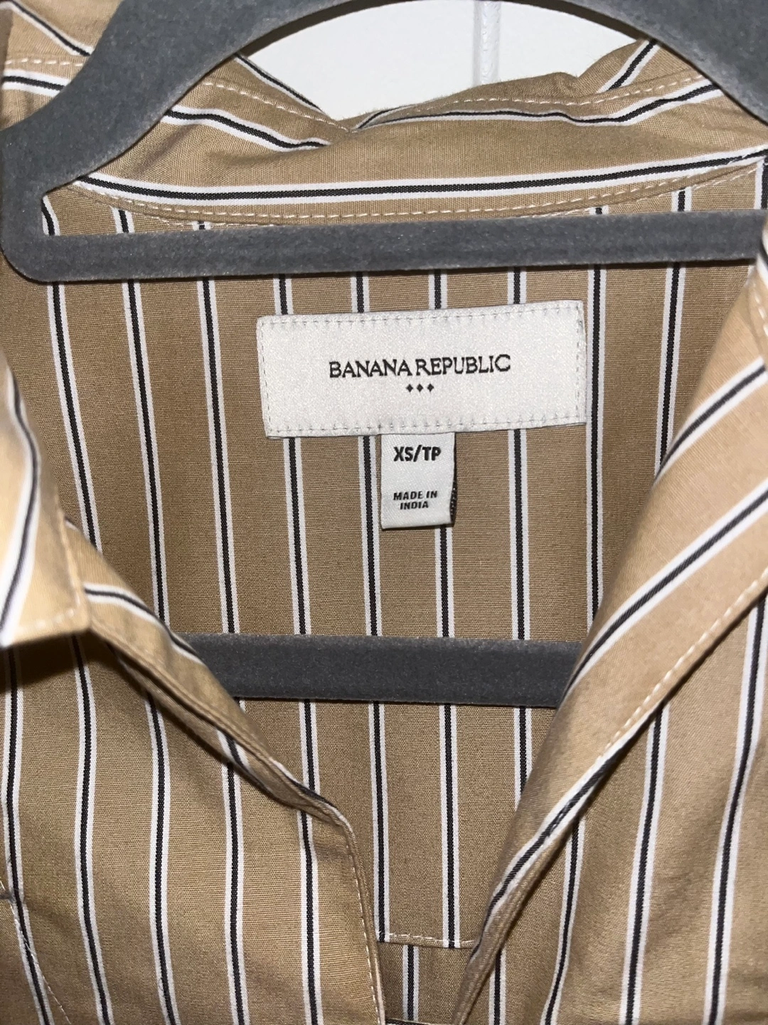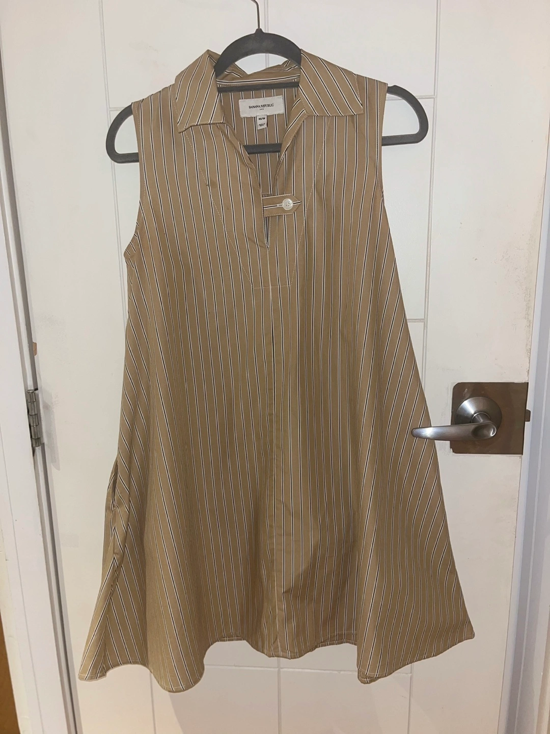 Striped sleeveless shirt dress. Collared, with a single button closure at the neck. A-line style with a slight flare at the hem.