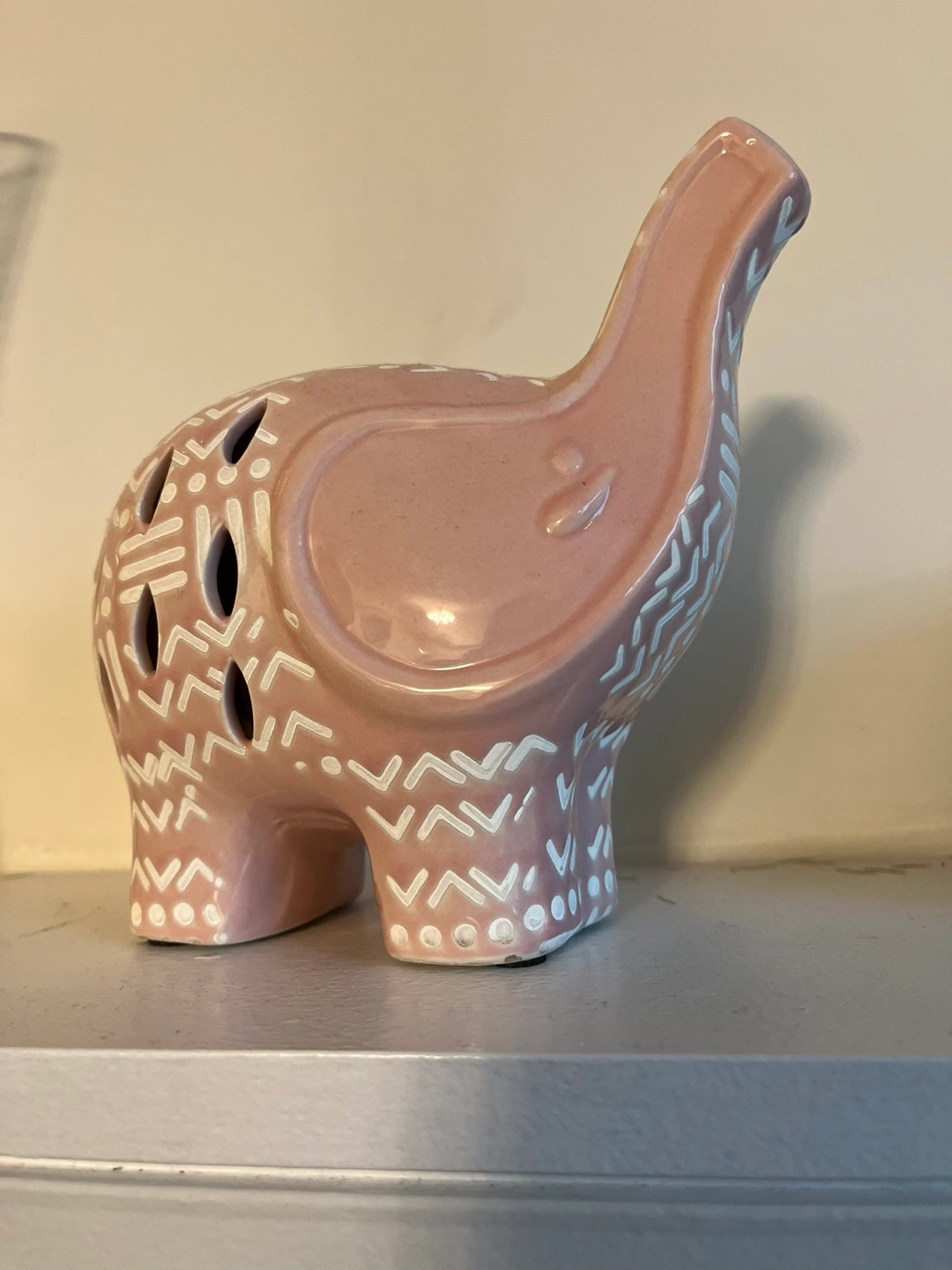 Pink ceramic elephant with white geometric patterns. Really cute statuette to decorate your bookshelf or fireplace