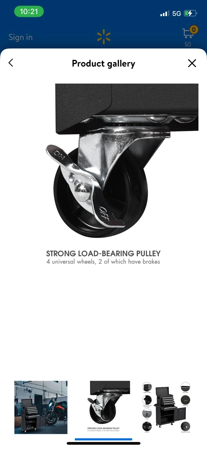 Tool chest and cabinet on wheels. Has multiple drawers, two cabinets, and a work surface.