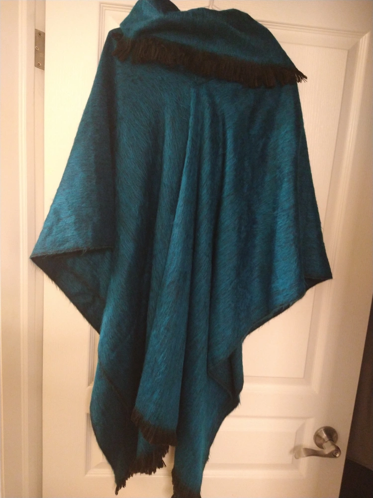 Teal alpaca poncho with black trim. Fringe around the edges. One size fits most.