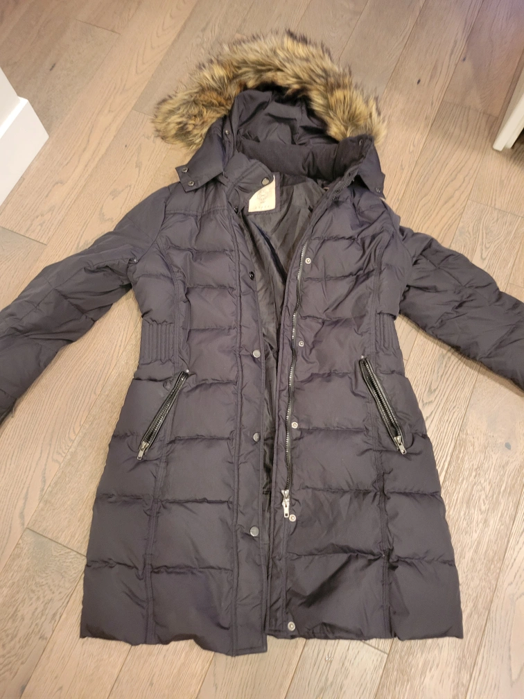 302Black puffer jacket with a fur-trimmed hood. Features zipper closure and multiple pockets. Down filled super warm. Great condition.
