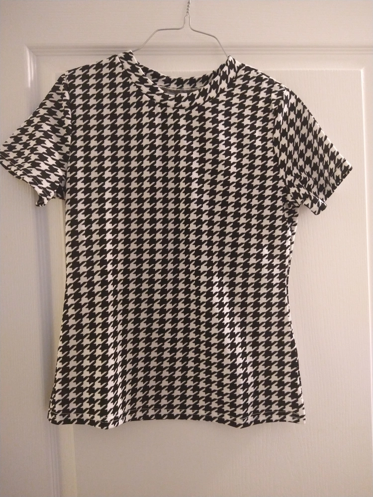 584Short sleeve top with a houndstooth pattern. Size Medium. 100% polyester. Machine wash cold gentle, with like colours. Non-chlorine.