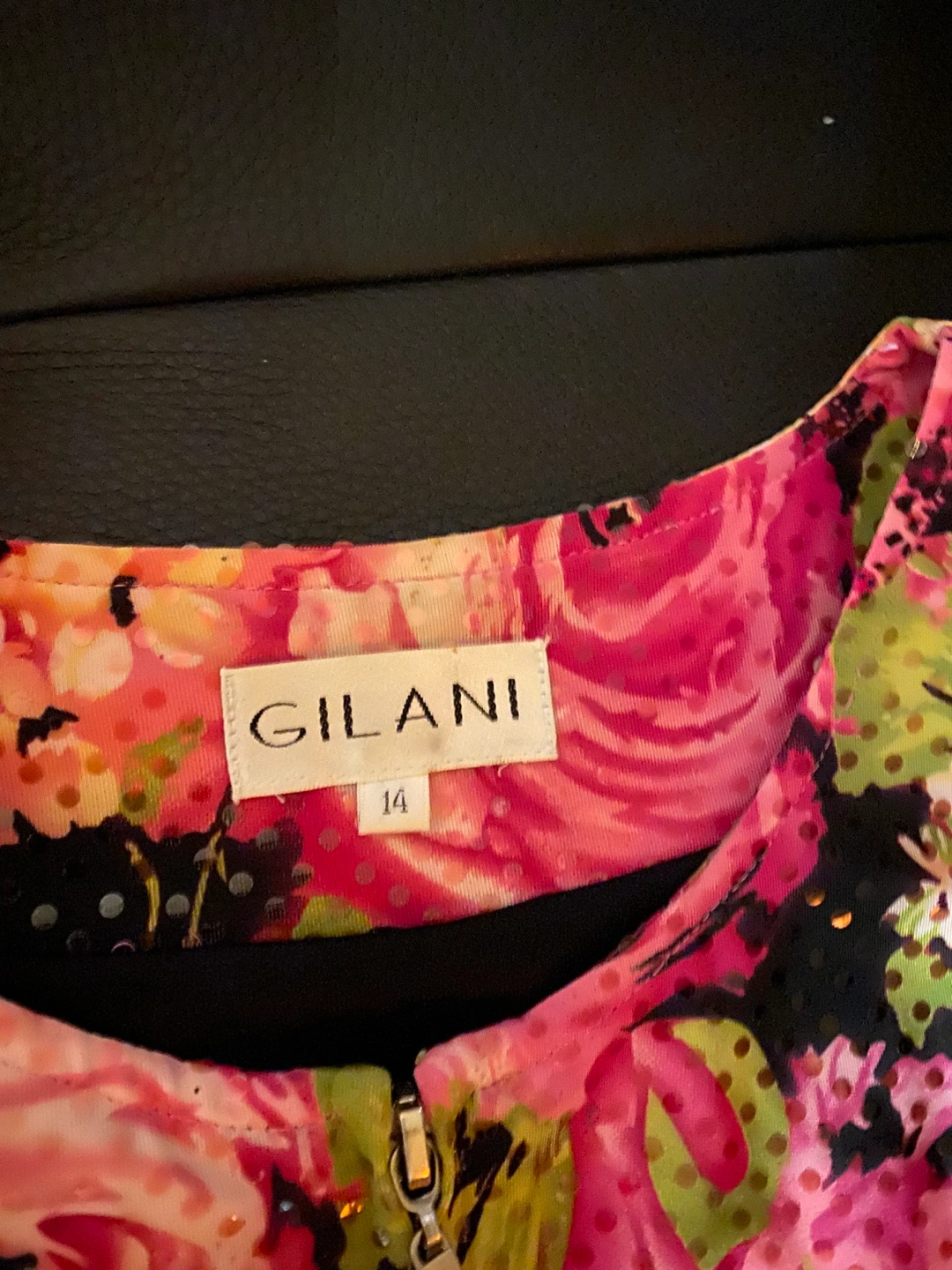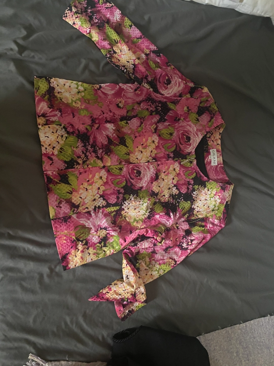 Floral print jacket with a zipper closure. Long sleeves. Sequenced detail. Very elegant, perfect with evening dress, pants or jeans (in black or cream or pink or Green. It’s a steel. I wish I were larger size I wouldn’t part with it.
