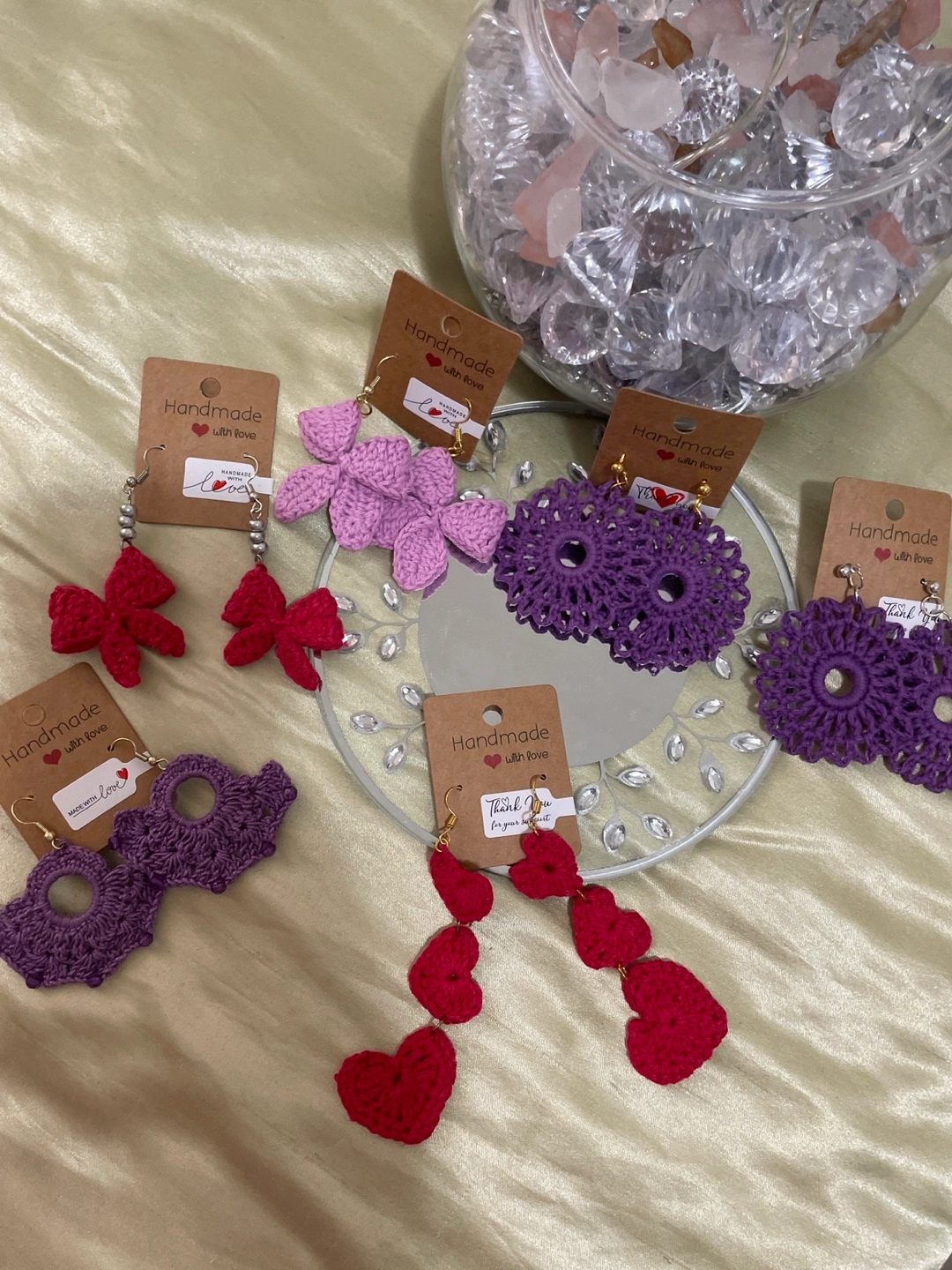 Crocheted earrings in various colours and styles. Some have beads. All have gold-coloured hooks. $5 for each