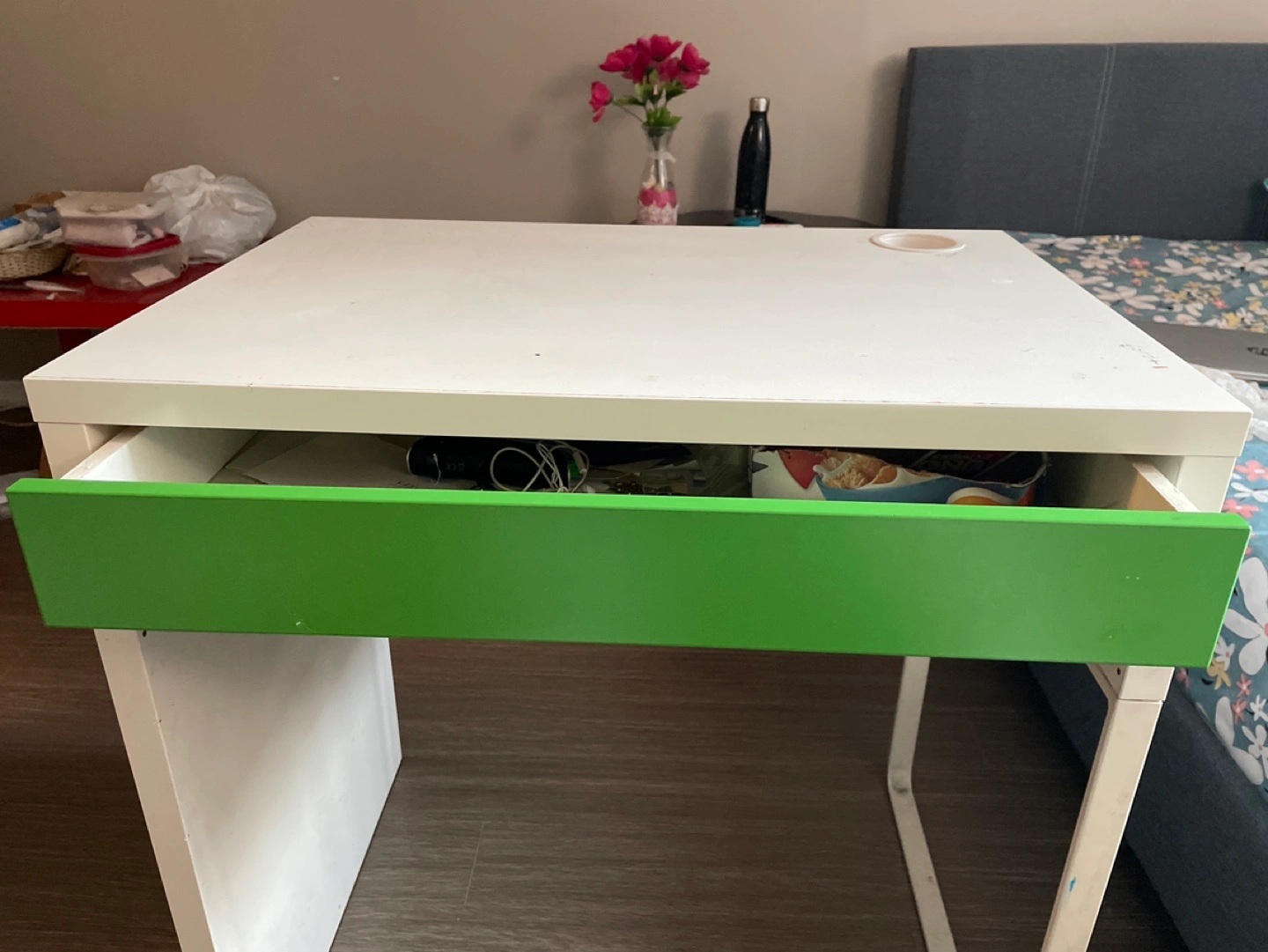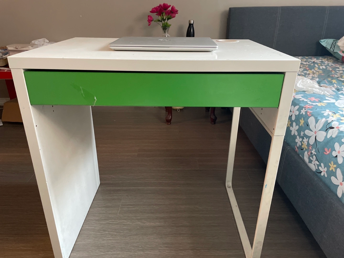 White desk with green drawer. For single person use for office work or study work. Some minor wear and tear.