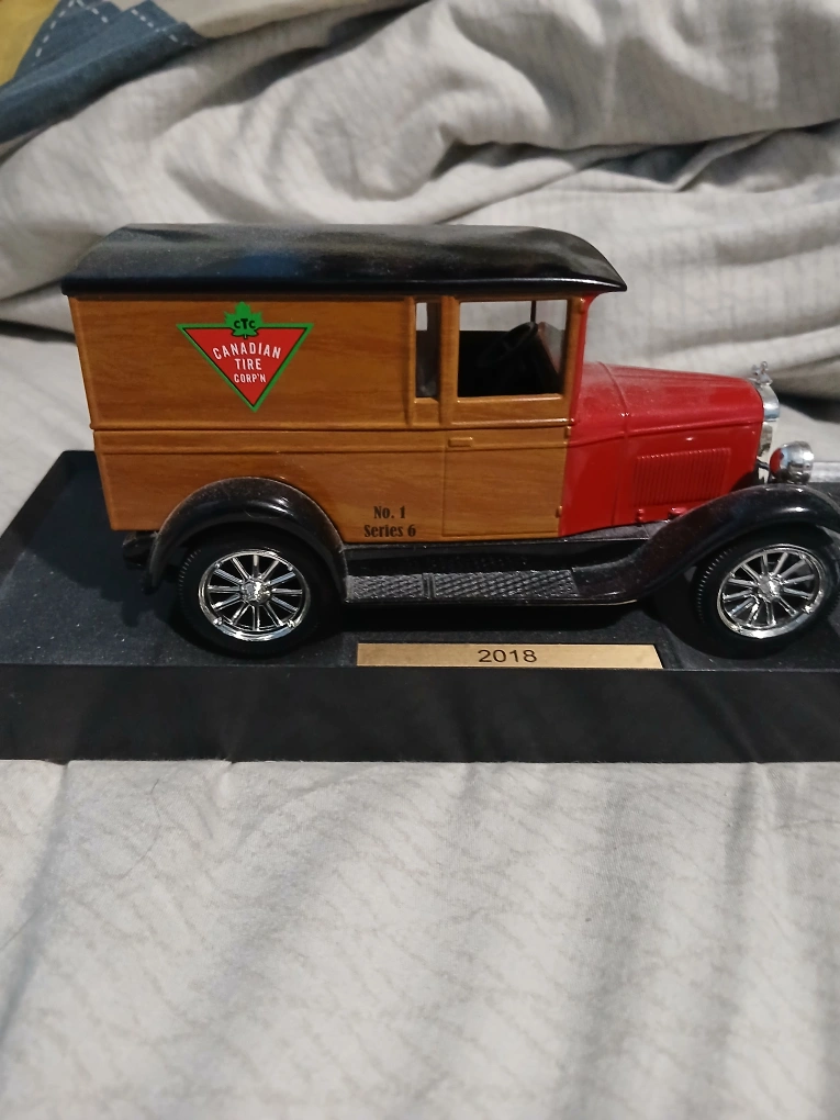 25Die-cast model of a 1928 Chevy Panel Van with Canadian Tire Corp'n branding. No. 1 Series 6. Comes on a black display base.
