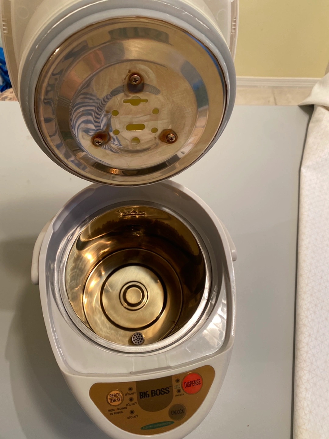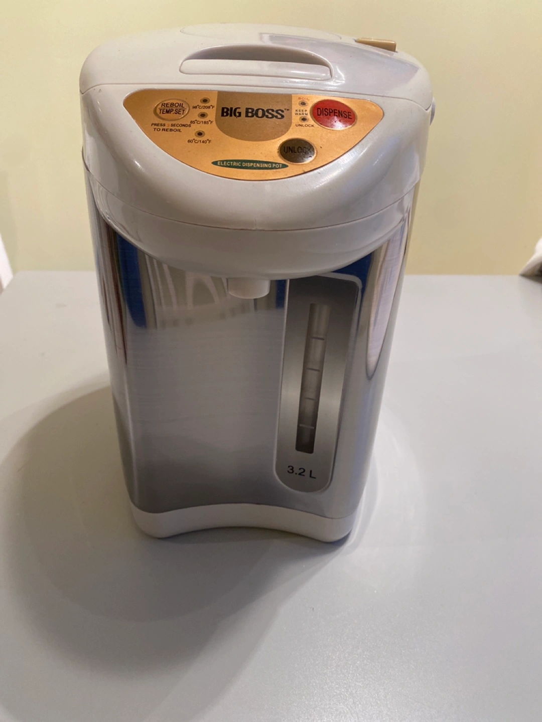 Electric dispenser pot. 3.2L. Stainless steel interior. Features re-boil, temperature setting, keep warm and dispense functions.