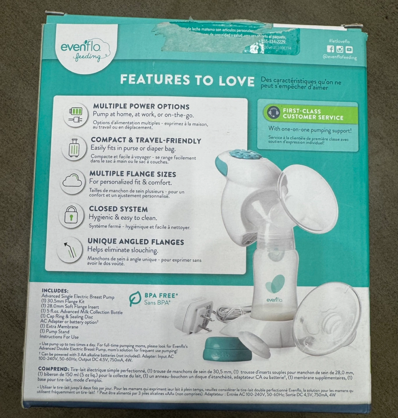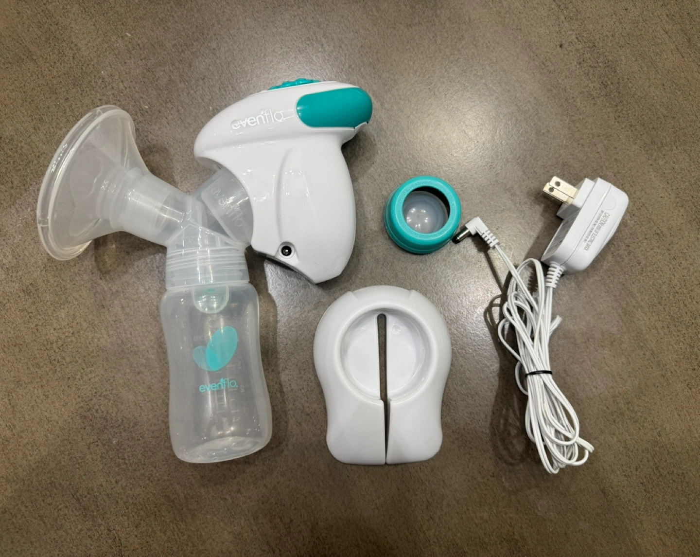 Single electric breast pump for occasional use pumping. Includes power adapter, bottle, flanges, and other parts.