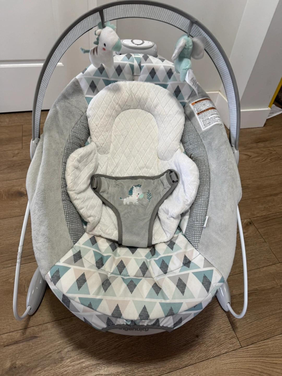Baby swing with multiple speeds and sounds. Includes a toy bar with hanging toys. Grey and white colour scheme with a geometric pattern.