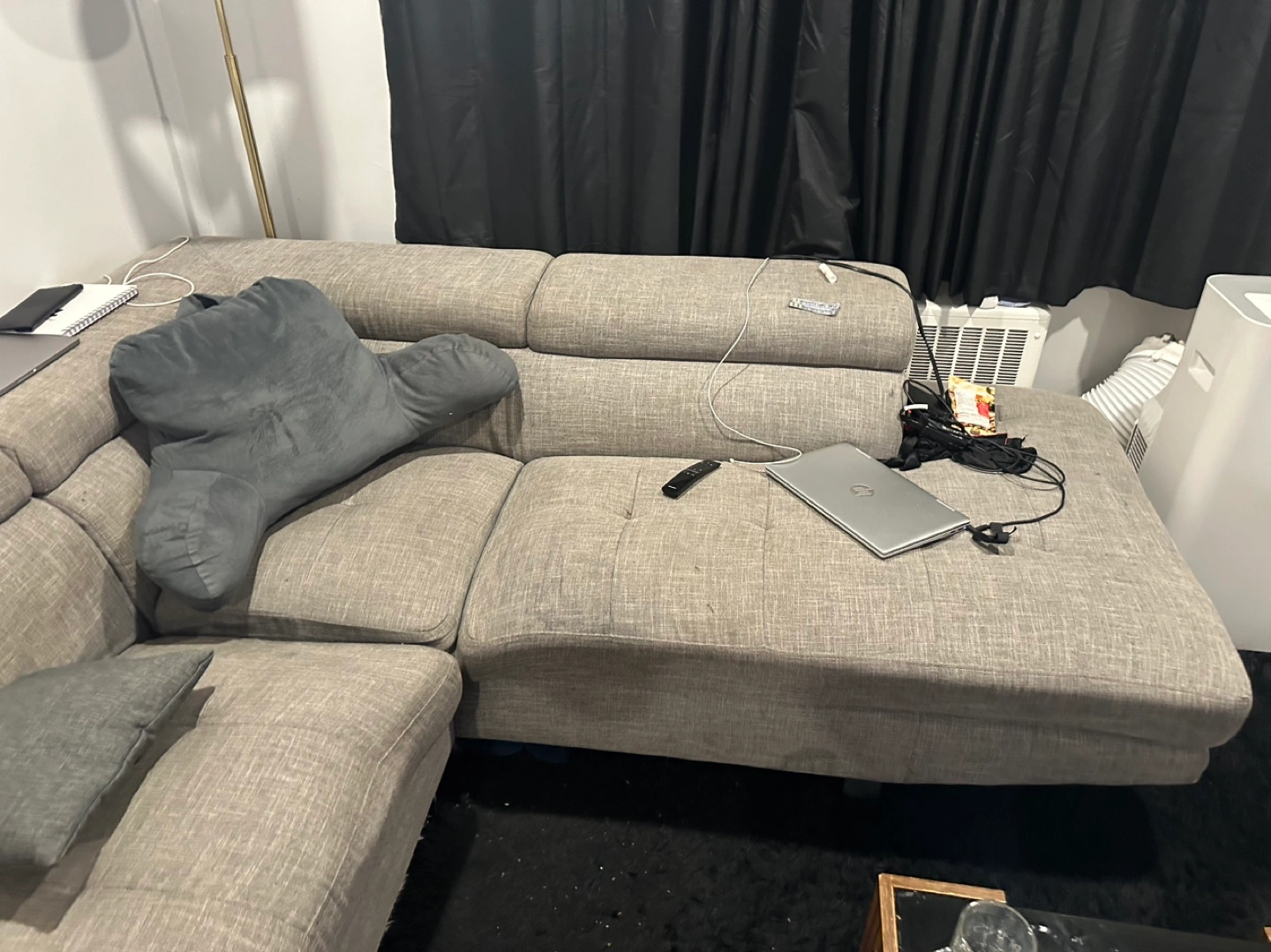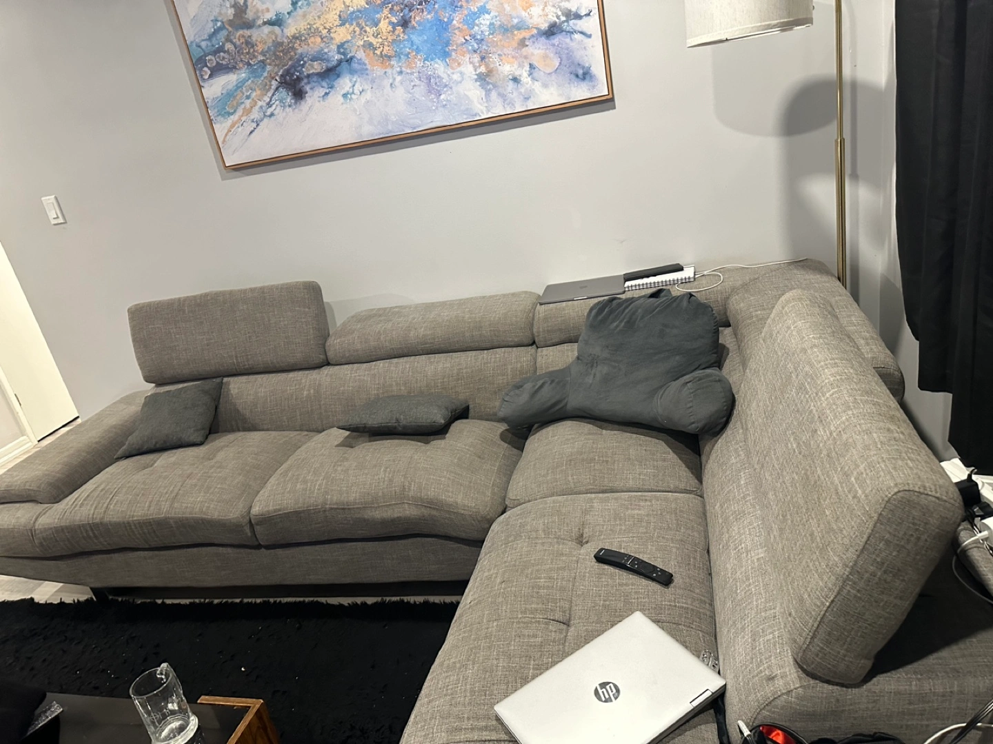 Grey sectional sofa, Detachablea and customizable layout with adjustable head rest for added comfort. Selling due to a move—other items available too! 500 or best offer