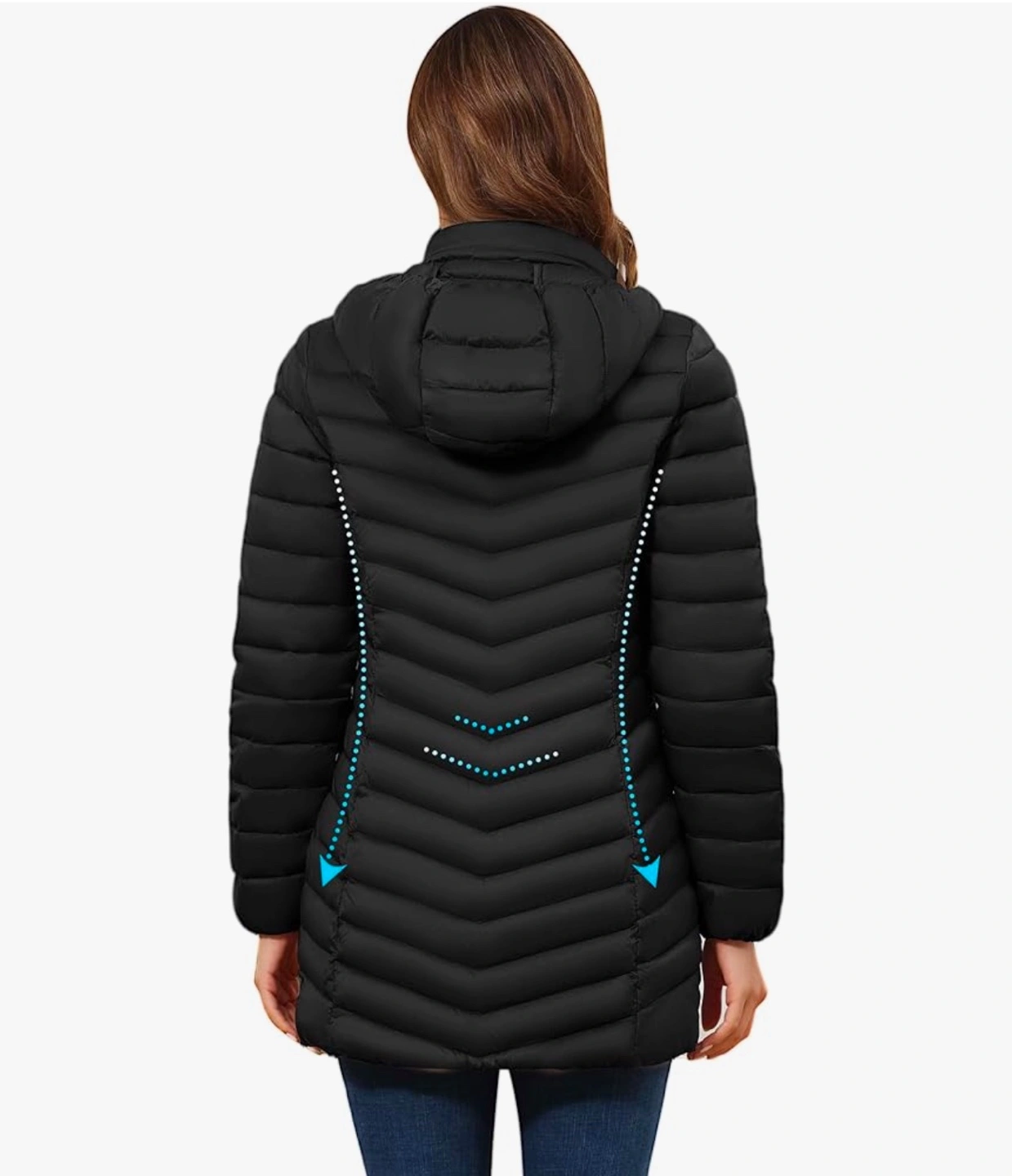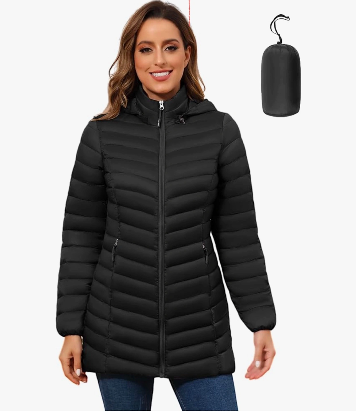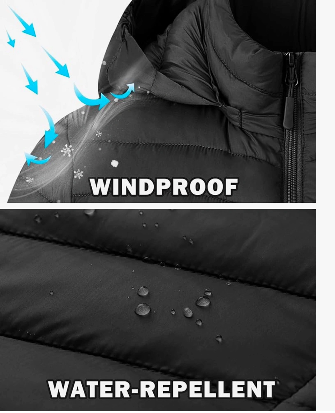Lightweight down jacket with hood. Water-repellent and windproof. Packs away into a small pouch.