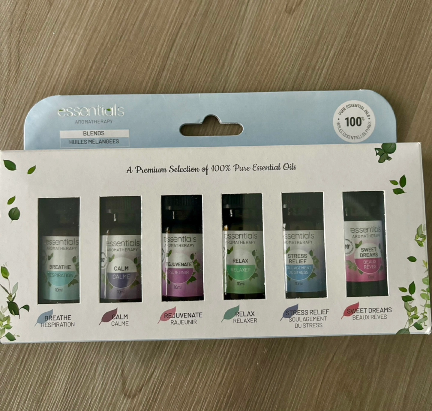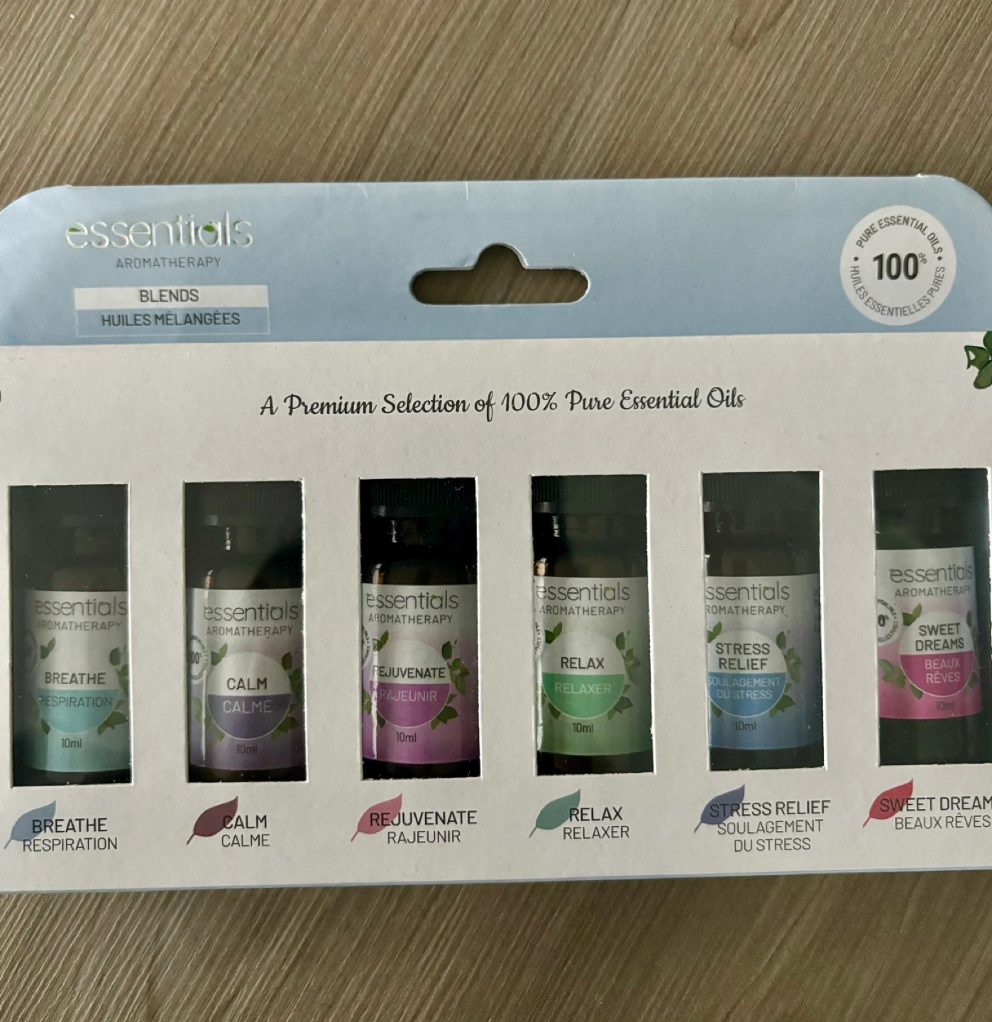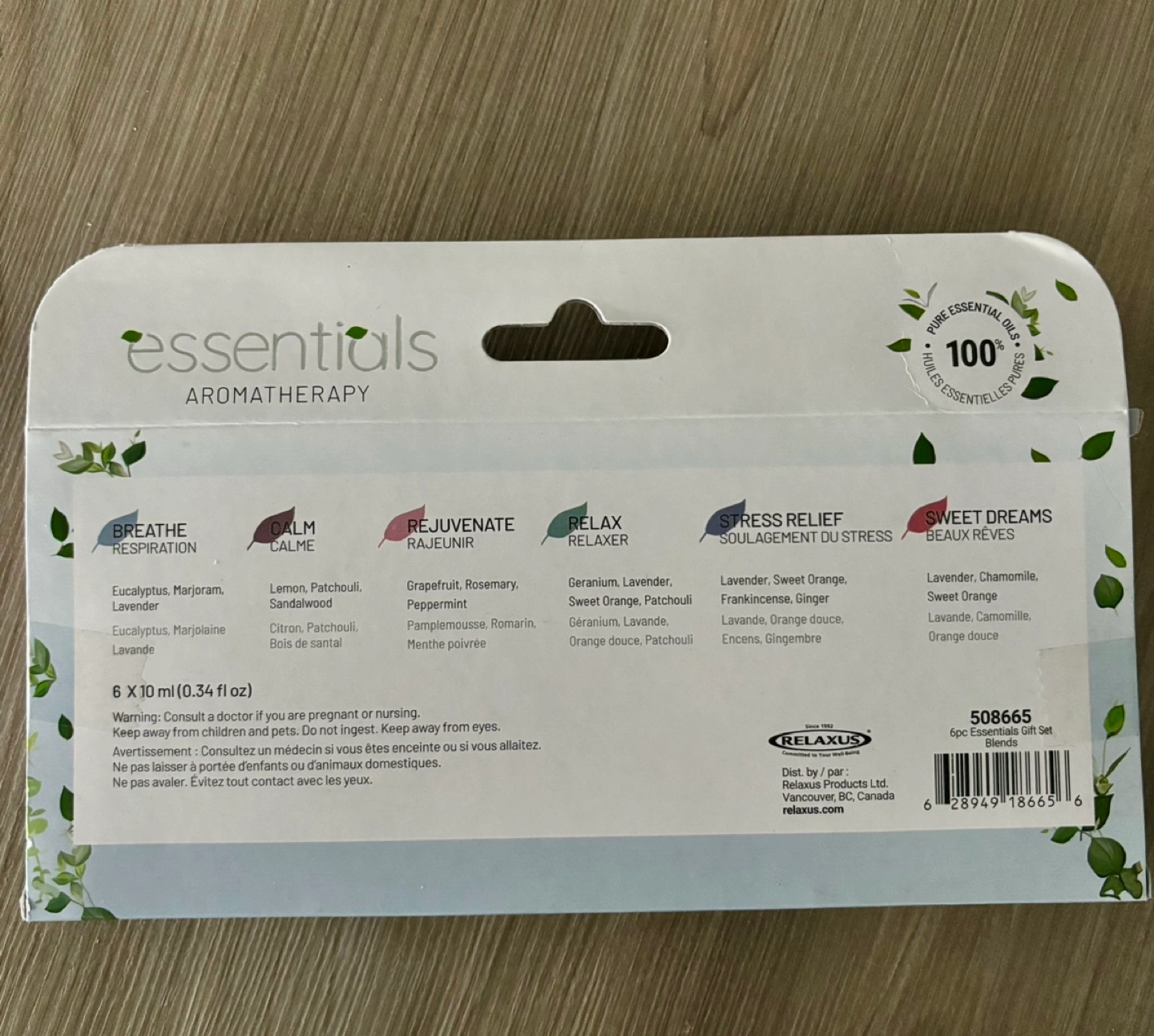 1000+Set of brand new six 10ml essential oil blends. Scents include Breathe, Calm, Rejuvenate, Relax, Stress Relief, and Sweet Dreams. A premium selection of 100% pure essential oils. I bought too many similar products in 2024 including this set, so decided to purge some. Price is for the whole set, or $3/bottle or $5/2 bottles if you want to buy 1-2 bottles before the set is sold. More info on the products: https://relaxusonline.com/products/essential-oil-blends-gift-set-6-x-10-ml-bottles Click on my name above to see my other listings and pickup locations.