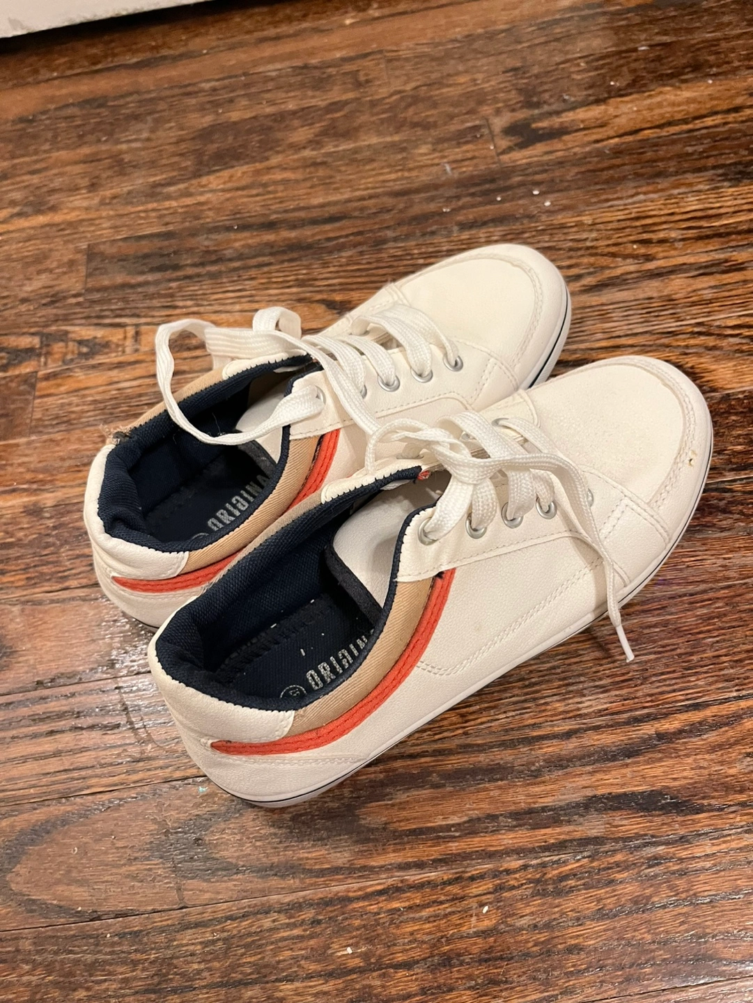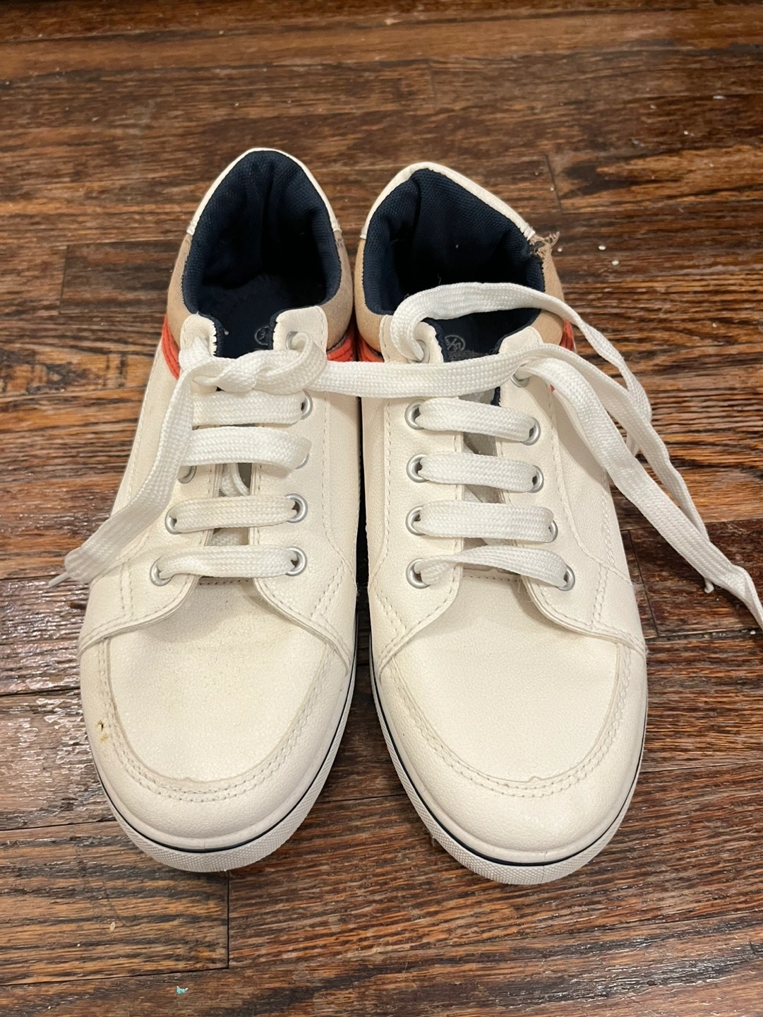 White canvas sneakers with red and blue accents. Lace-up closure.