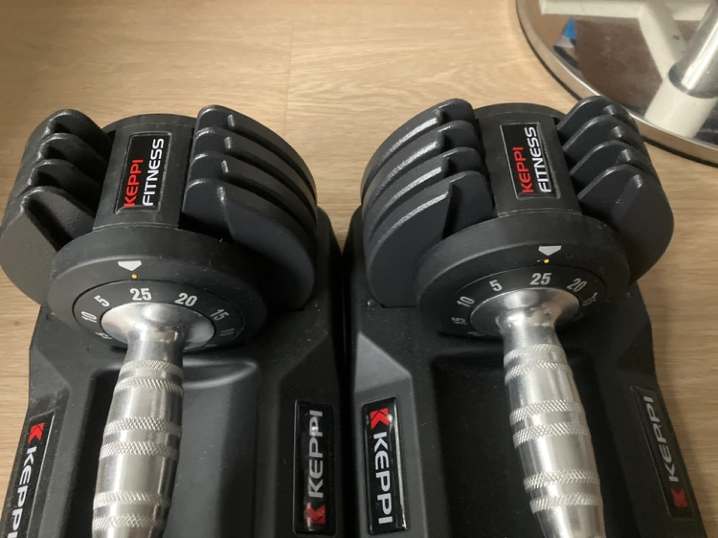 Pair of adjustable dumbbells. Can be adjusted from 5 lbs to 25lbs, in 5lbs increments. Works great.