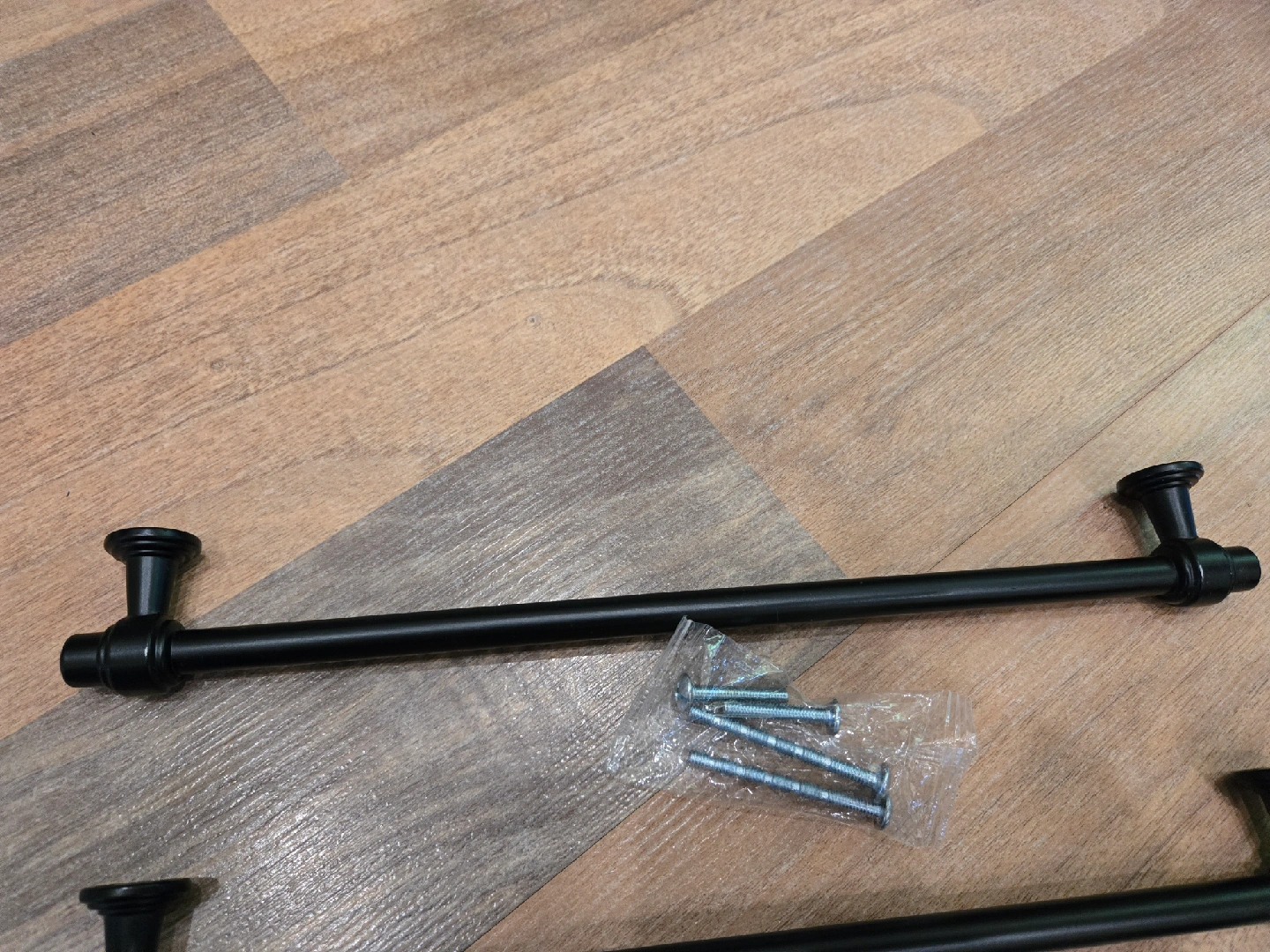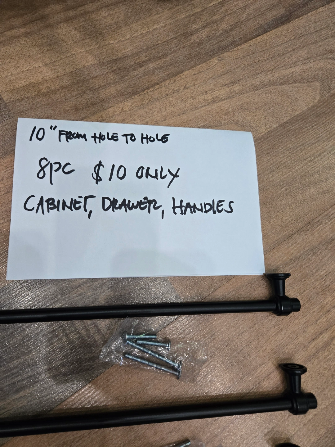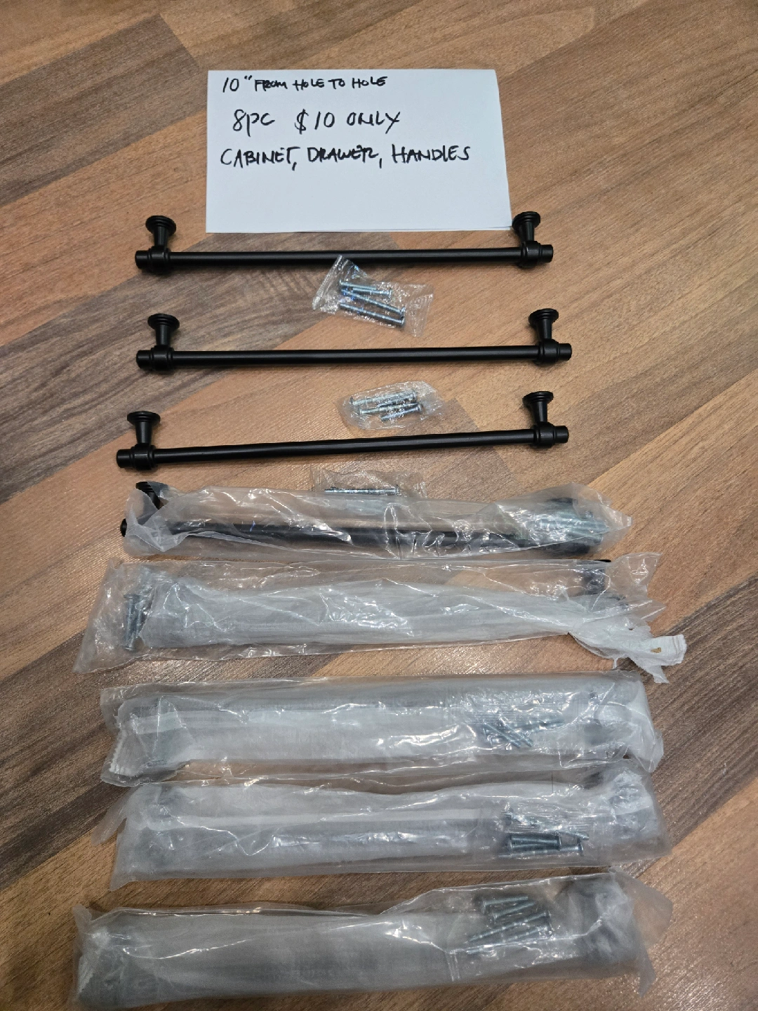 Selling a set of eight brand new cabinet or drawer handles. They are black and measure 10 inches from hole to hole. All the screws are included!