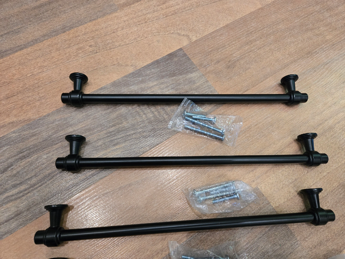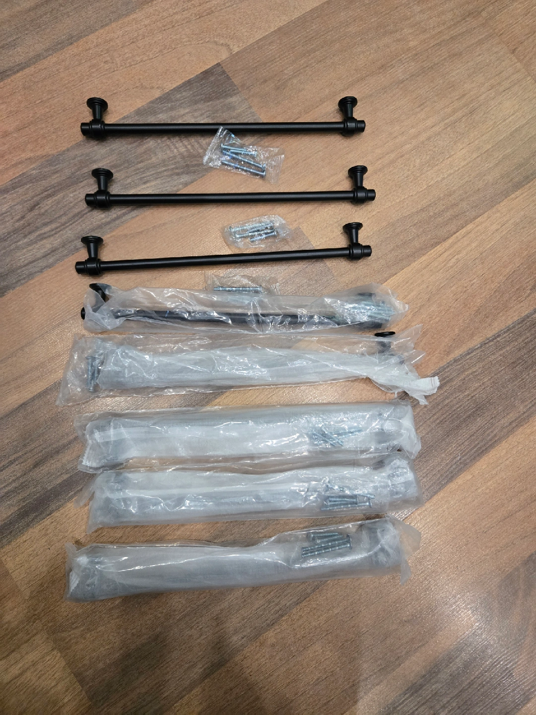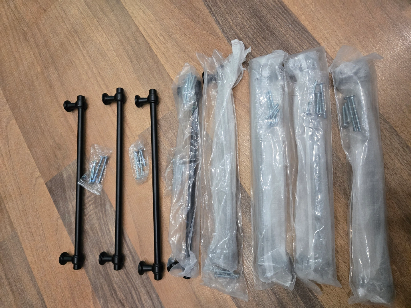 Selling a set of eight brand new cabinet or drawer handles. They are black and measure 10 inches from hole to hole. All the screws are included!
