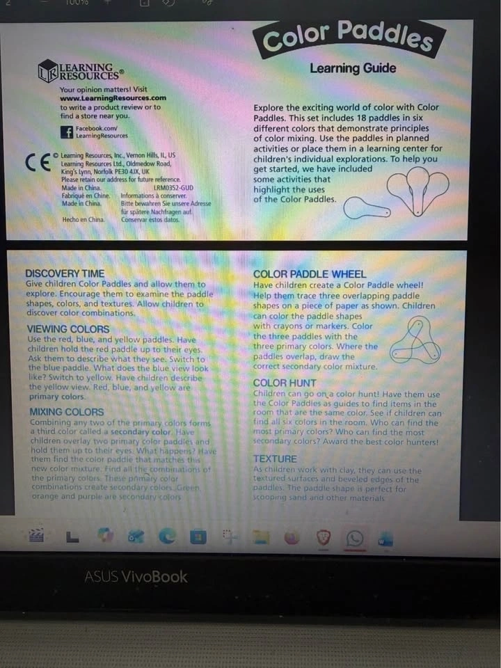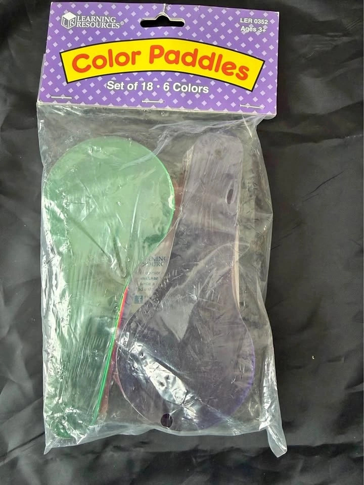 New set of 18 color paddles to allow exploration of colour mixing. 3 each of red, orange, yellow, green, blue, and violet.