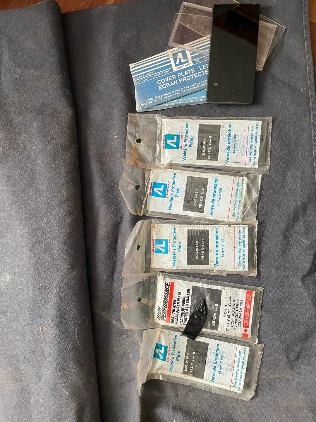 Package of welder's protective plates. Includes 5 plates still in package. Shade 10-H and 11-H. Random loose plates also included. Packaged clear plastic plates as well.