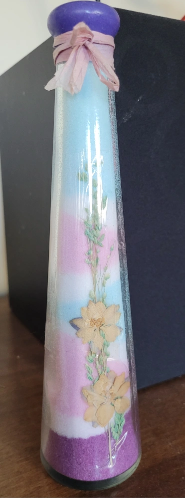 Glass bottle with a purple lid, filled with layers of coloured sand and pressed flowers. Comes with a pink ribbon.