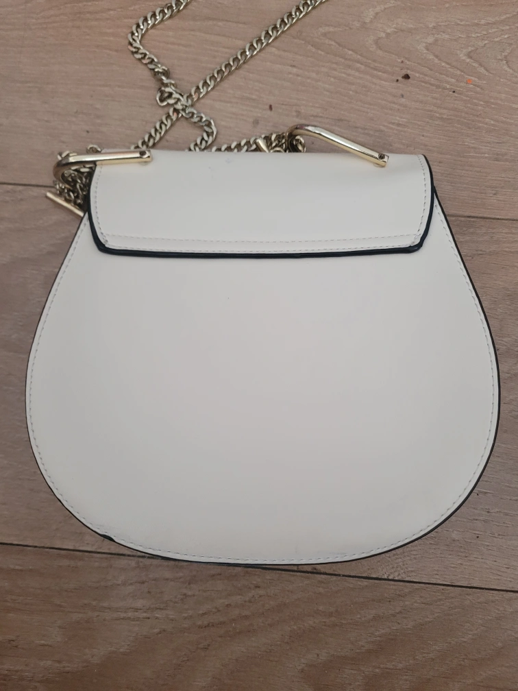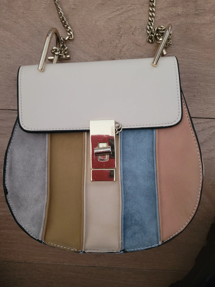Small shoulder bag with a chain strap. Multi-coloured suede and leather. Gold-tone hardware.