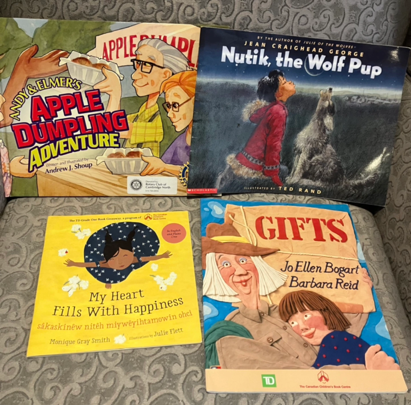4 children's books. Includes titles: Andy & Elmer's Apple Dumpling Adventure, Nutik, the Wolf Pup, My Heart Fills With Happiness, Gifts.