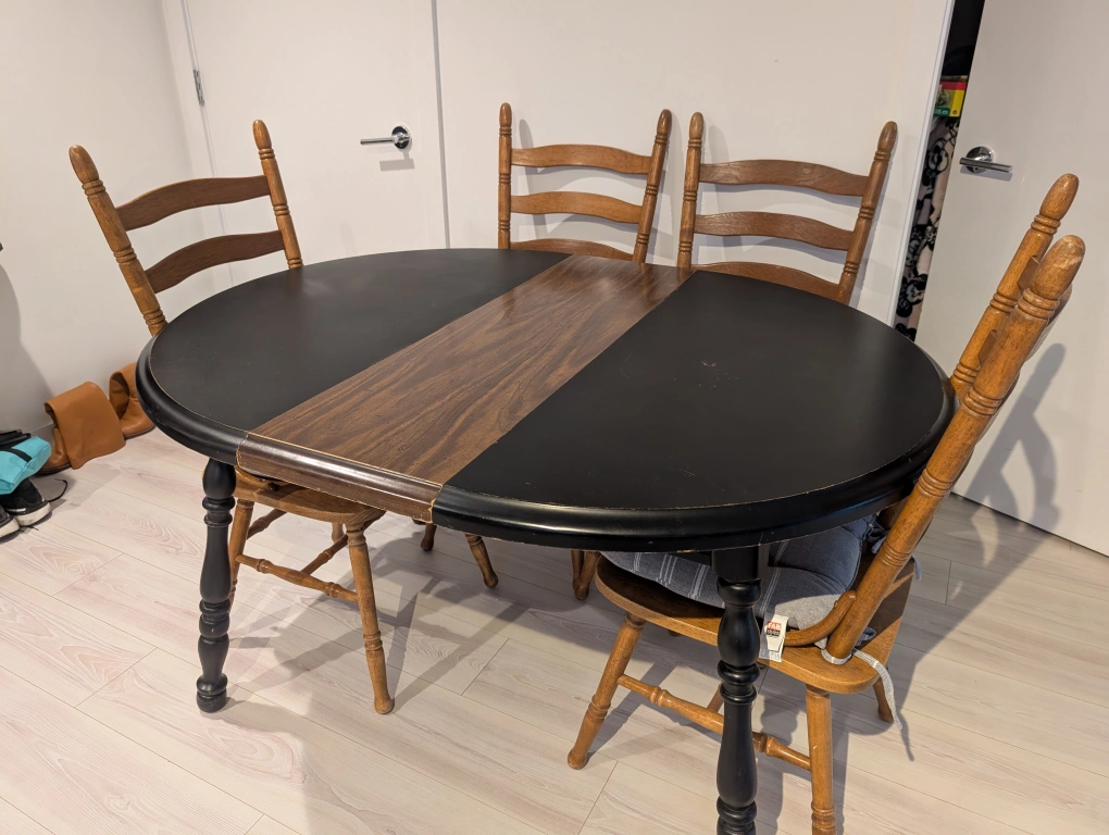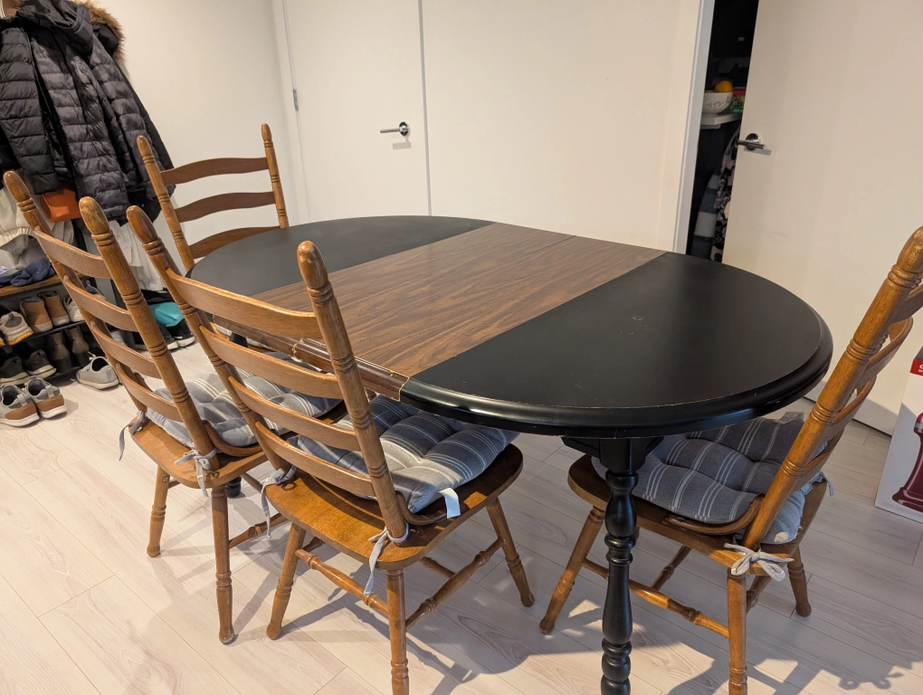 Vintage table and 4 chairs with cushions. Table has 2 extendable leafs. Fits up to 6 people