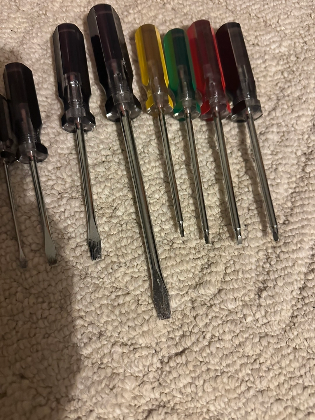 Assortment of screwdrivers. Various sizes and head types. Some have coloured handles. There’s 14 different types and sizes