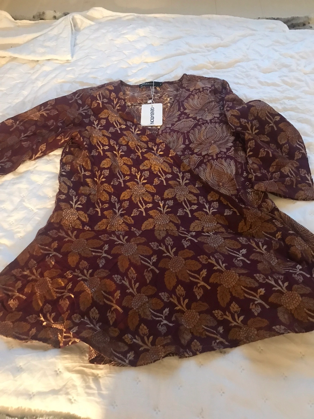 109Burgundy floral print with gold accents. Wrap style dress with 3/4 sleeves and a flowy skirt. Pick up 145 hillcrest Avenue Mississauga