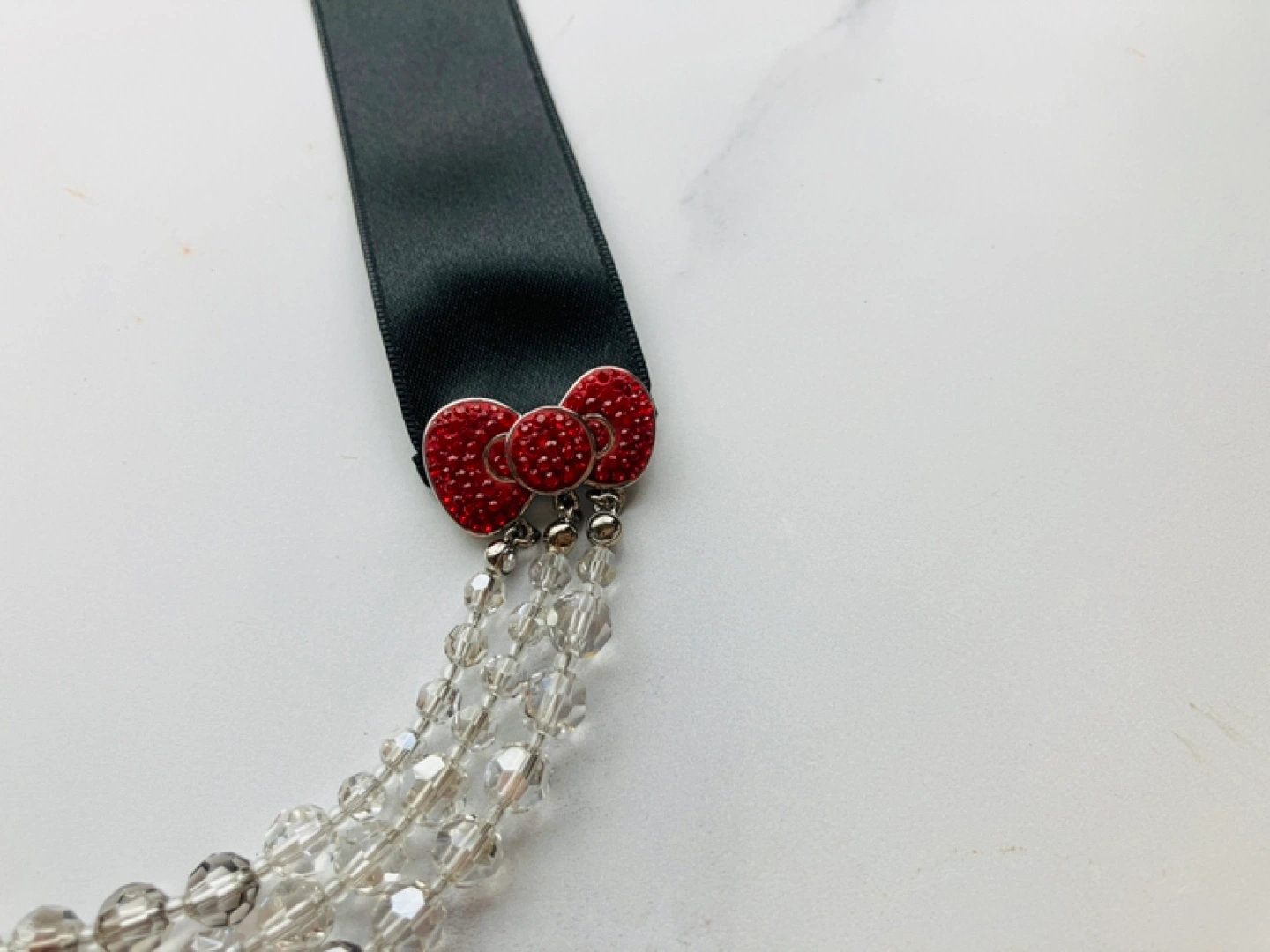 Multi-strand necklace with a black bow, red beads, and a silver charm. Perfect condition. This is quite a unique and statement piece, perfect for festive season. Also a collector piece for Hello Kitty lovers.