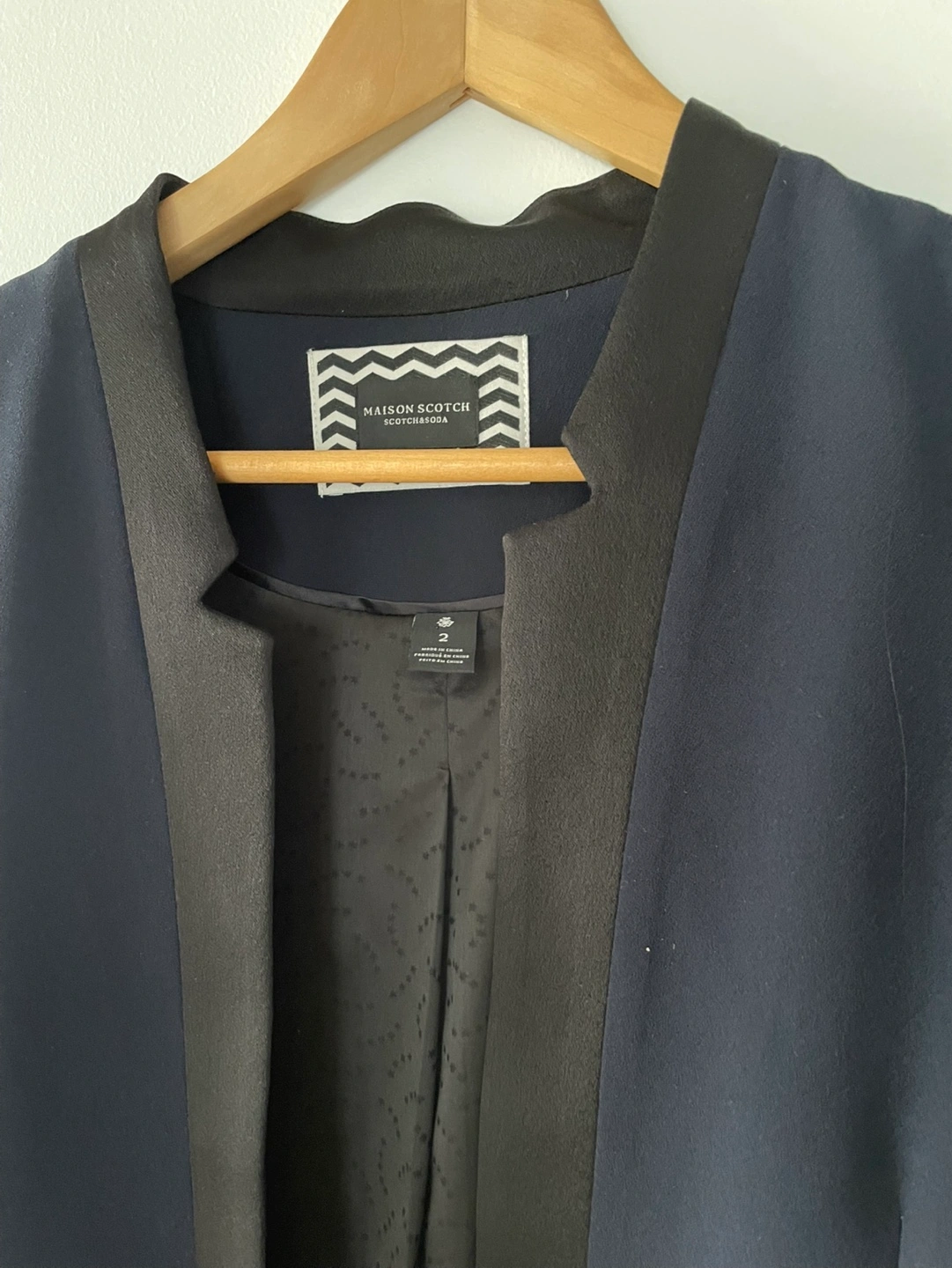 Navy blue blazer with satin lapels and buttons on the cuffs. Long sleeves.