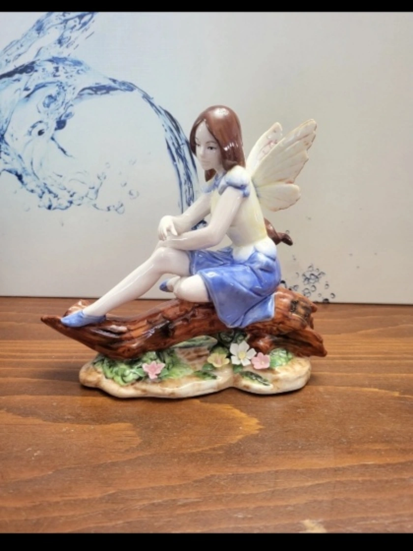 Beautiful porcelain fairy figurine, sitting on a log with flowers. Comes in a blue box. In excellent condition.