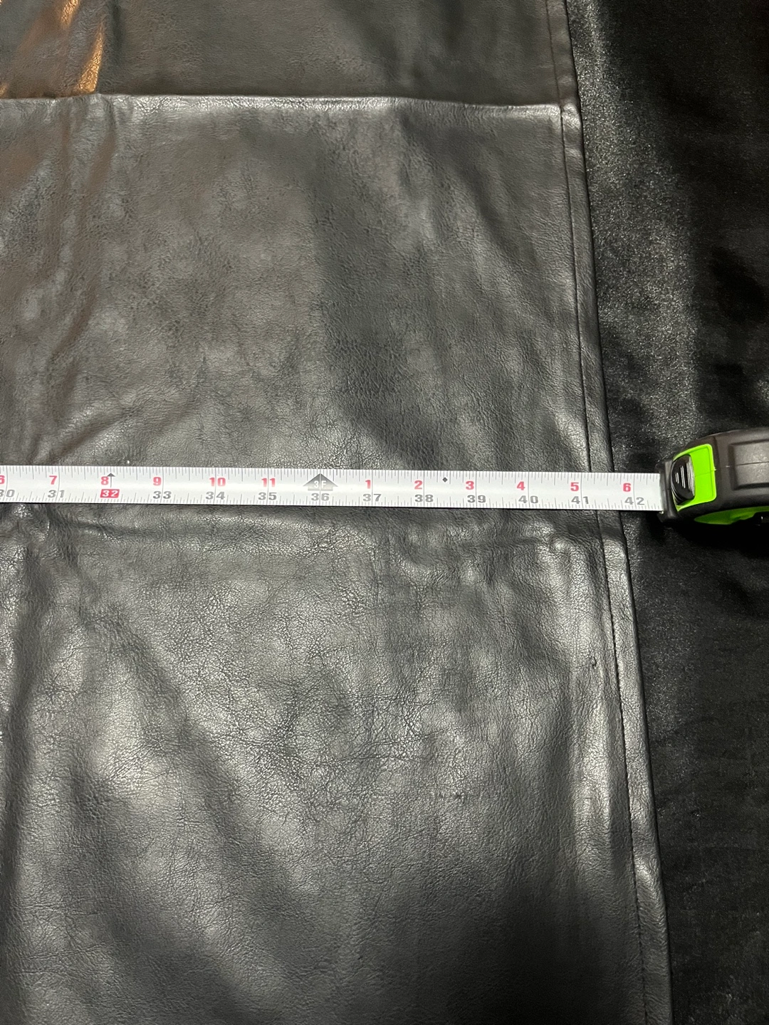Black faux leather curtains with 4 grommets. Approximately 42 inches wide and 84 inches long. 2 panels. Block out light. Some colour has faded on the underside as expected from the sunlight otherwise perfect condition.