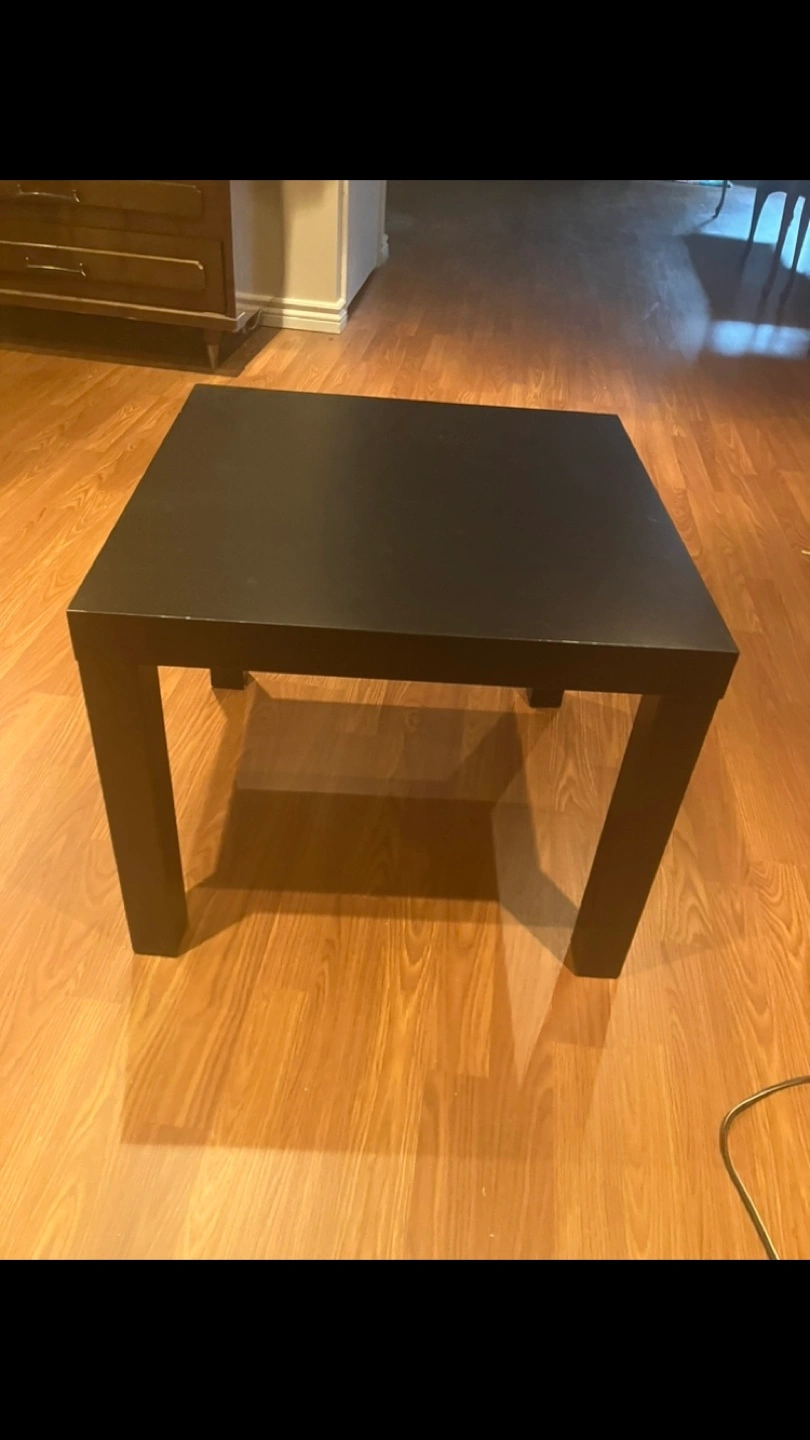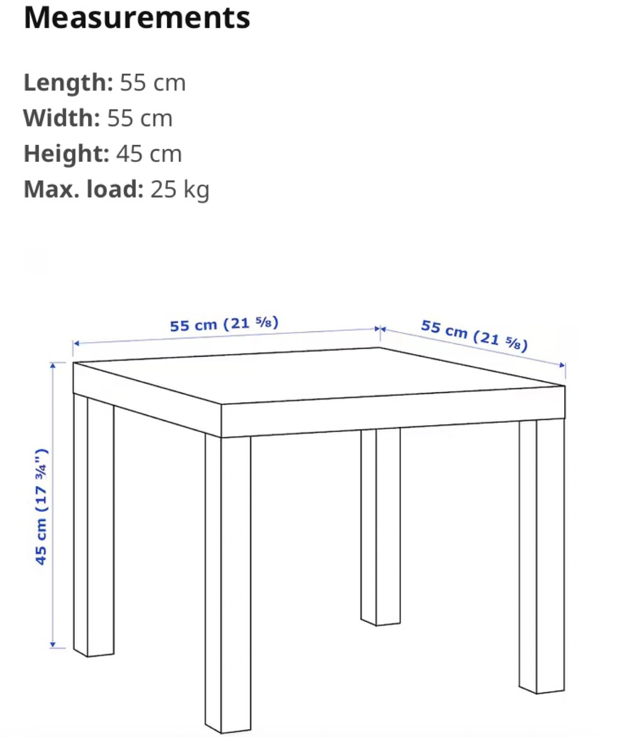 Black square coffee table with four legs. Measures 55 cm x 55 cm x 45 cm. Approximately 21 X 21 X 17 inches.
