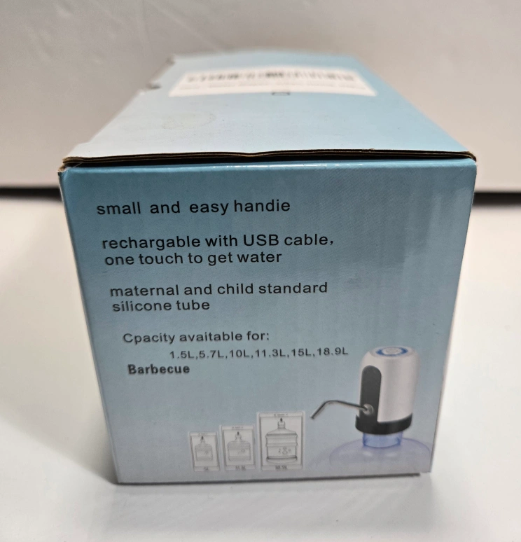 Rechargeable with USB cable, one touch to get water. Maternal and child standard silicone tube. Capacity available for: 1.5L, 5.7L, 10L, 11.3L, 15L, 18.9L. Barbecue