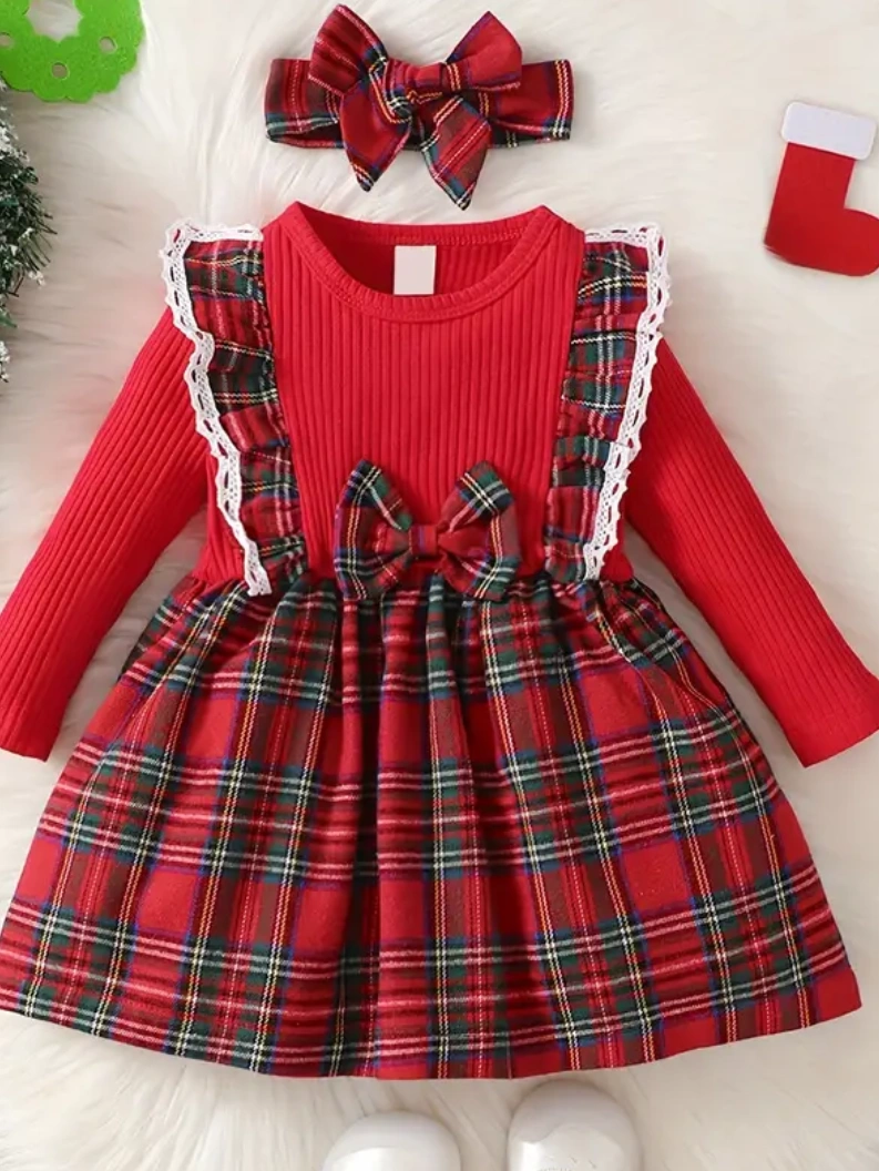 Red plaid dress with long sleeves, a red bow, and white lace trim. Includes a matching plaid headband. Perfect for Christmas!