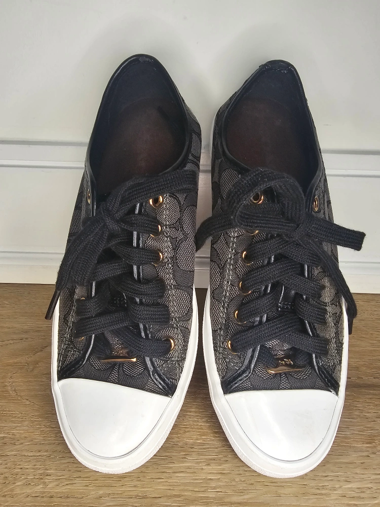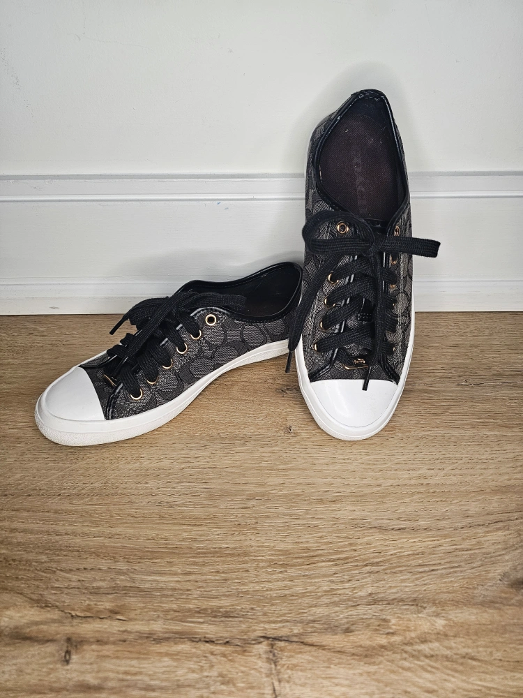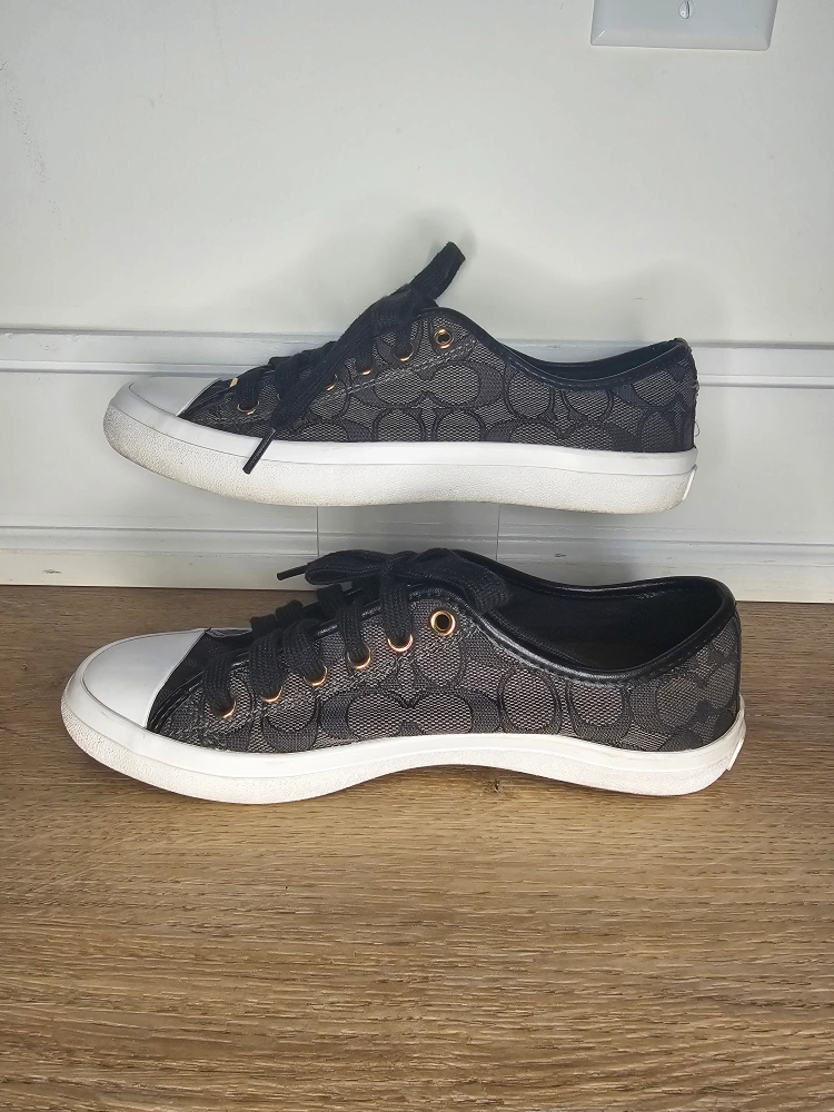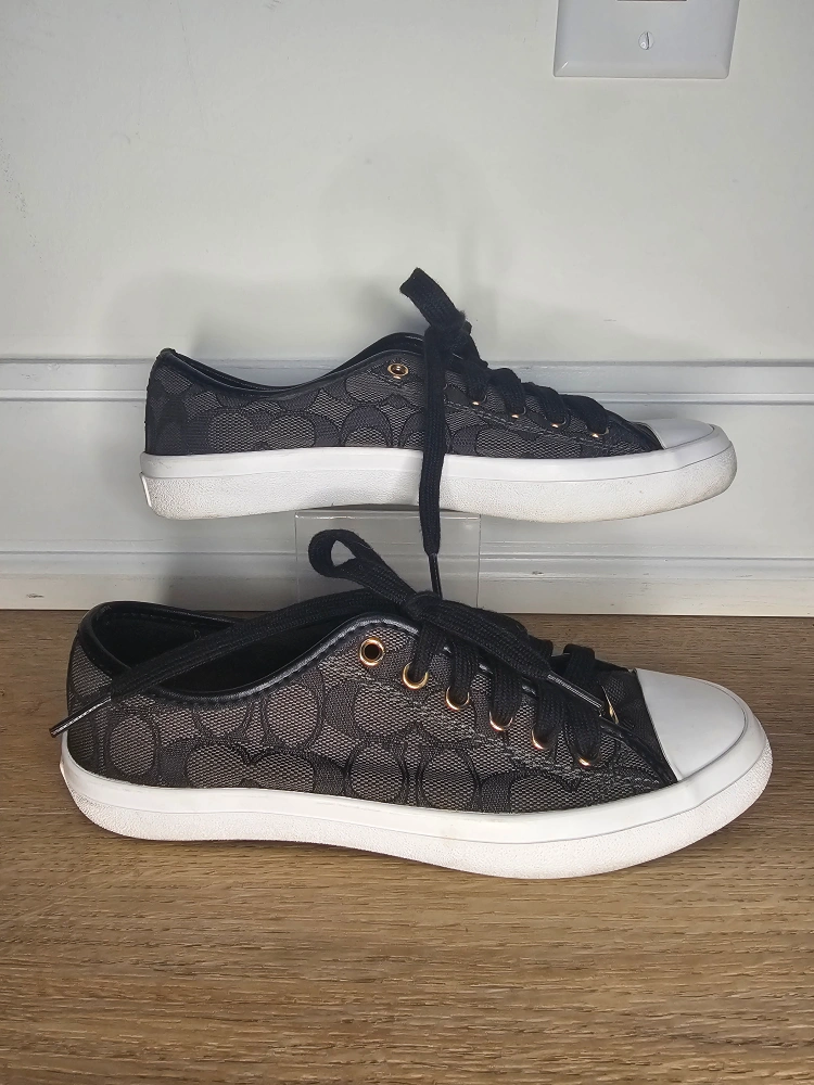 These are Coach black monogram fabric lace sneakers with black leather accents and gold rivets. These are in good used condition, wear to insoles. see photos.