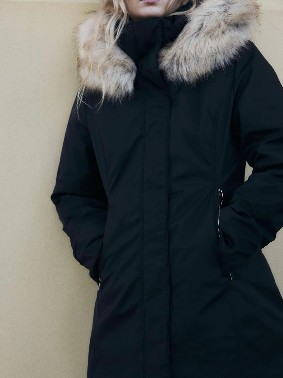 Long black winter parka with a faux fur hood. The jacket has a zipper closure and two zippered pockets on the front. It is lined with a soft material for warmth. Can stand temp as low as -20 C