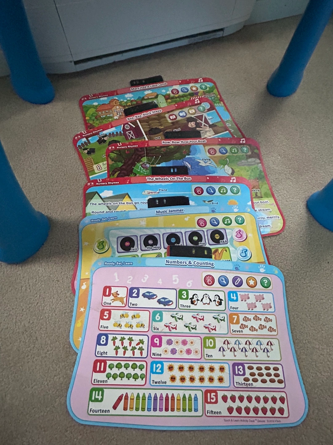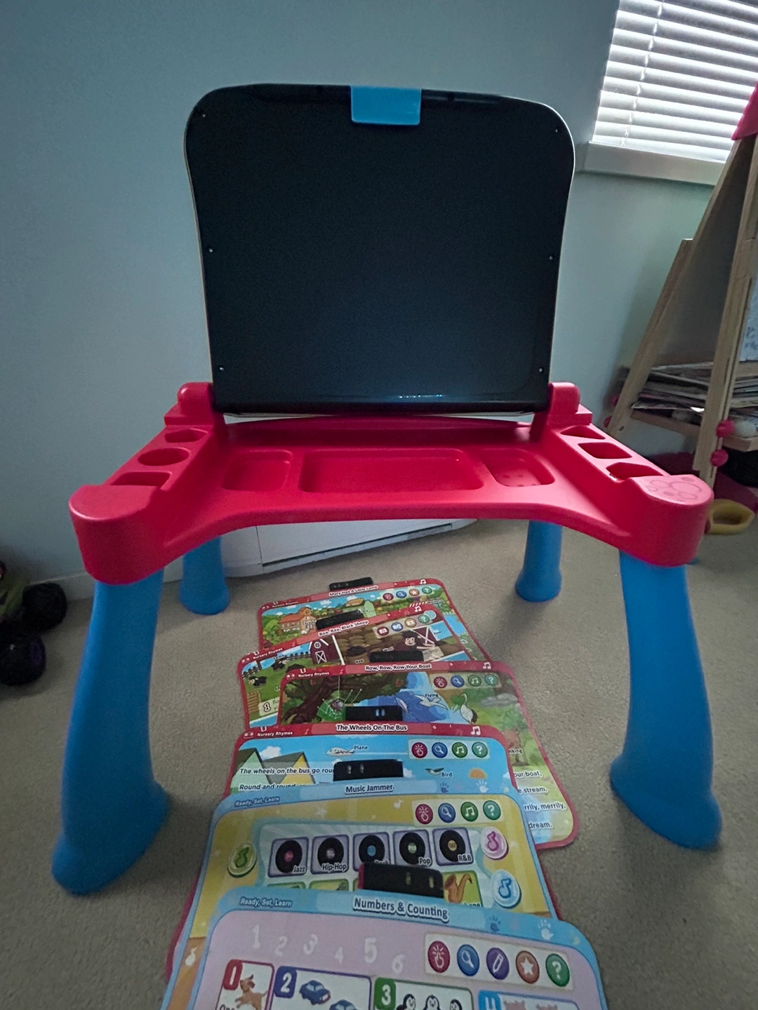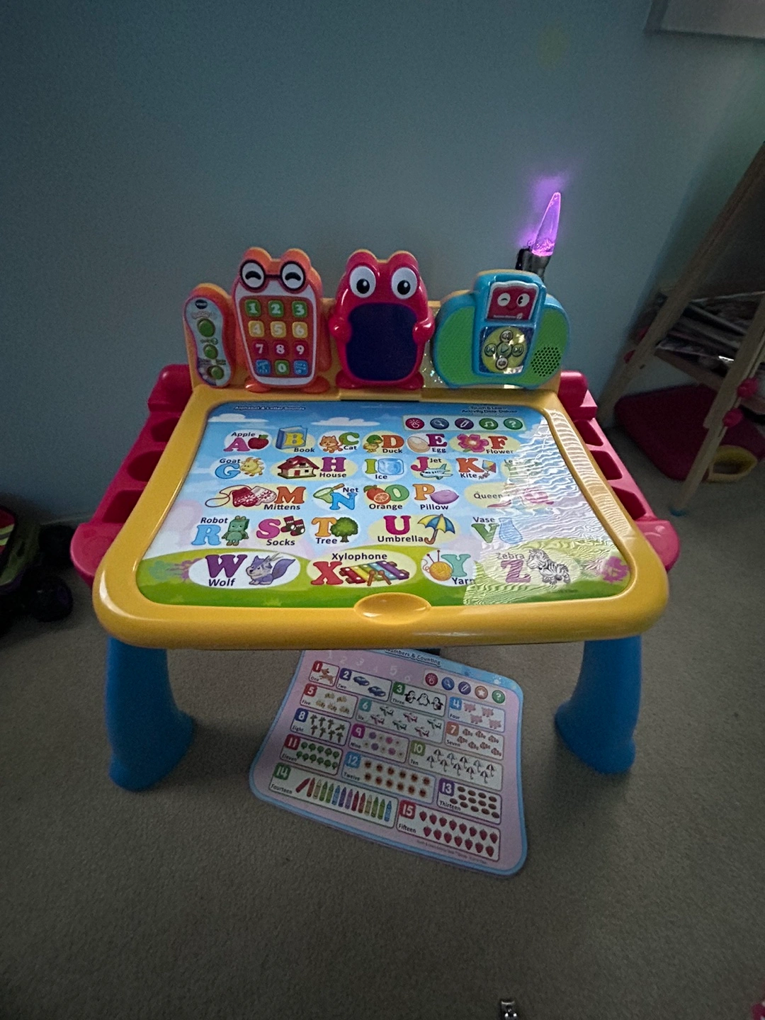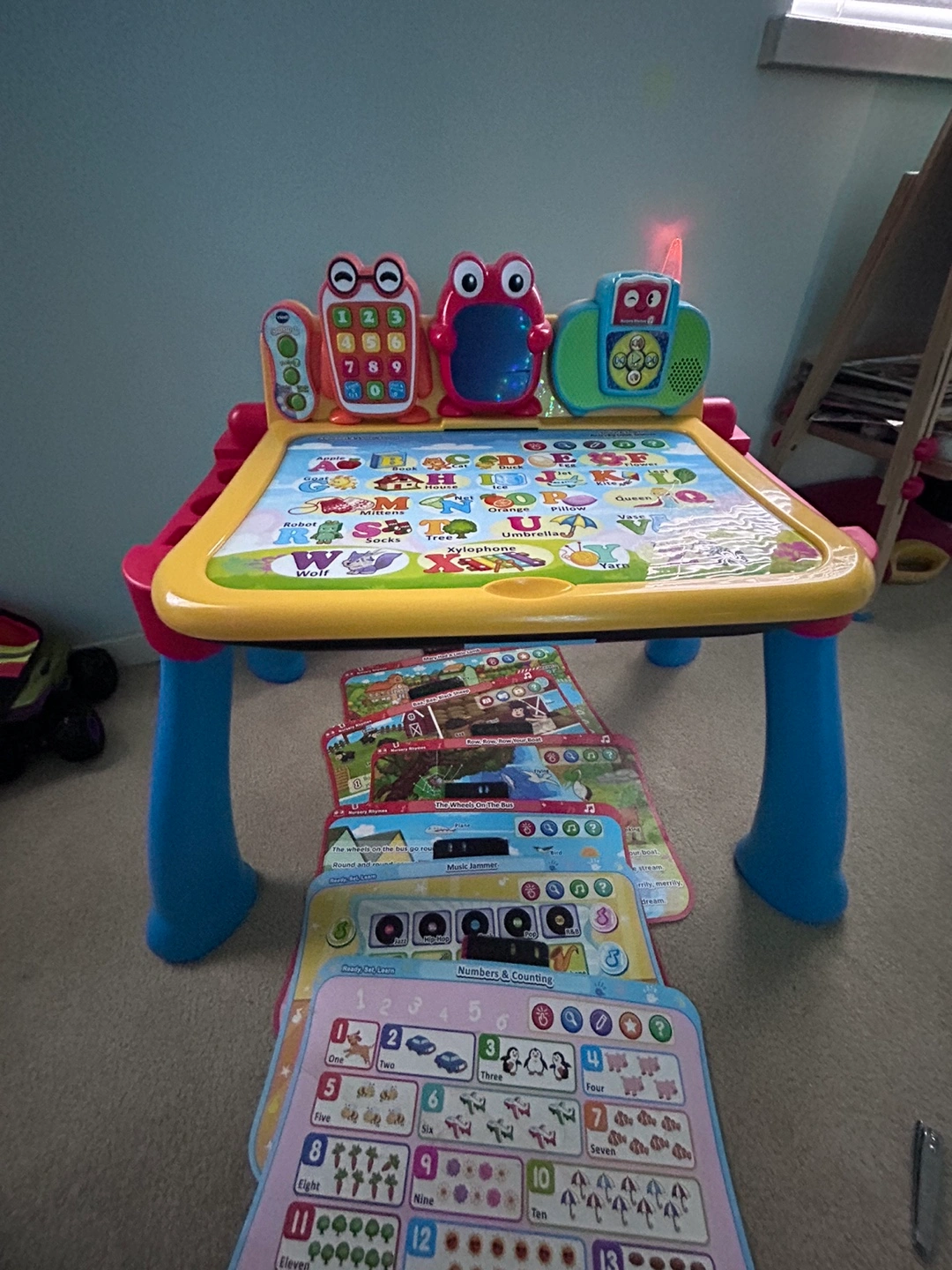 Interactive learning desk with multiple activities. Includes various learning cards. Features a light-up screen. With stool