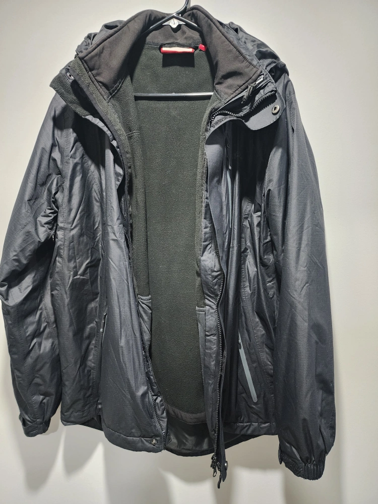 Selling a pre-owmed, but in excellent condition Black winter jacket with a hood. Fleece-lined. Zipper closure and multiple pockets.