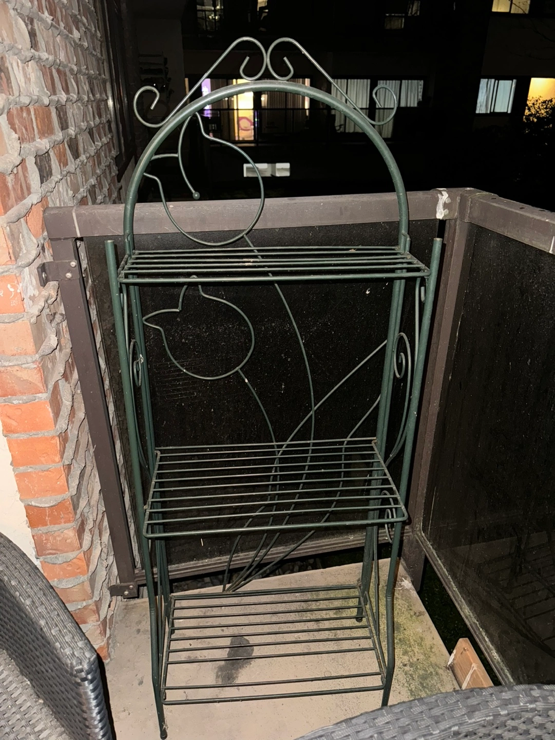 Three-tier metal plant stand with decorative scrollwork. Good condition.