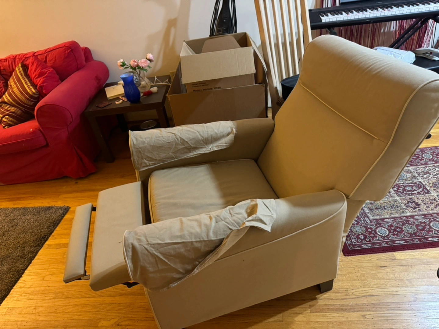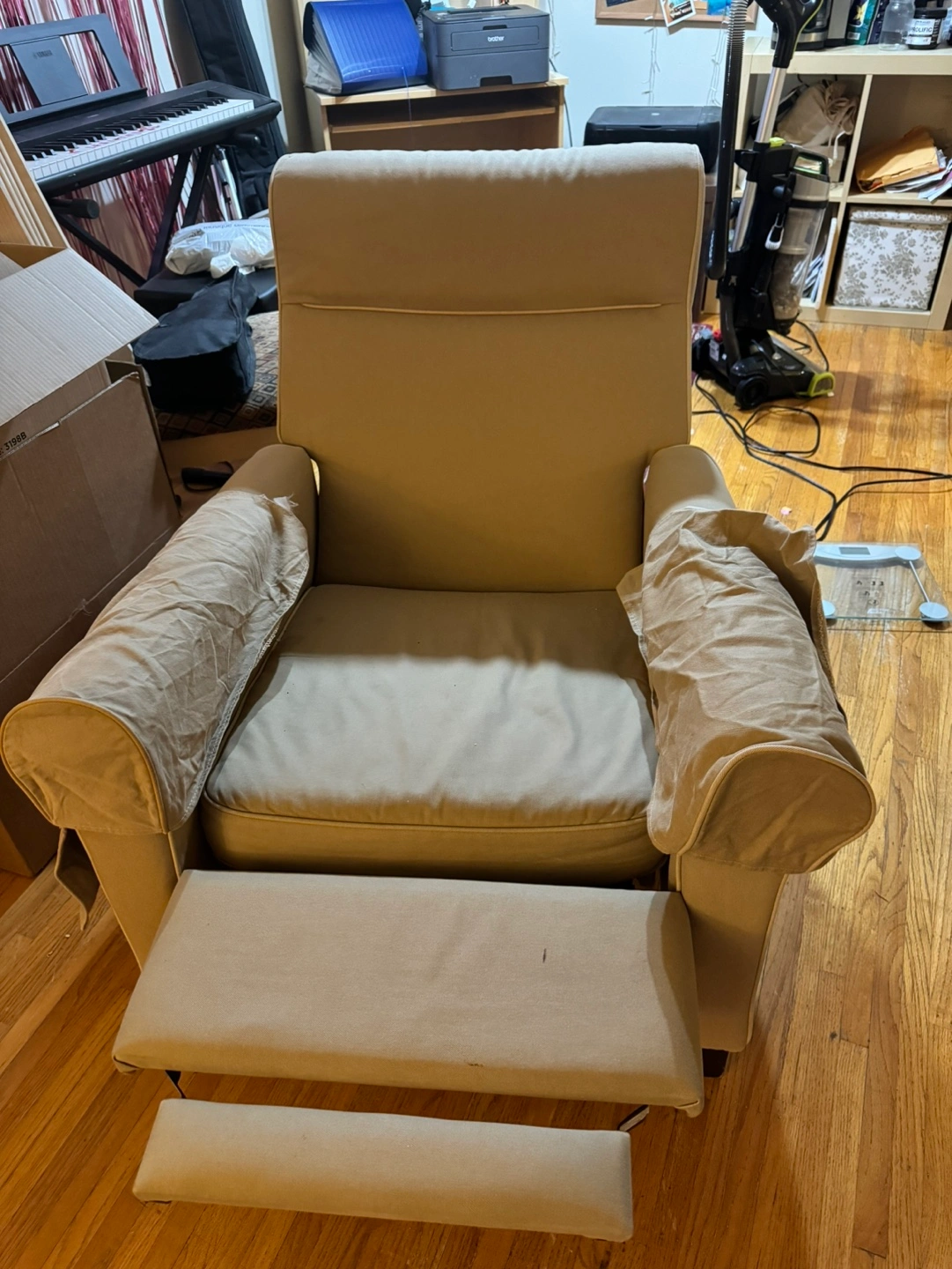 Beige fabric recliner with armrests and footrest. Great condition.